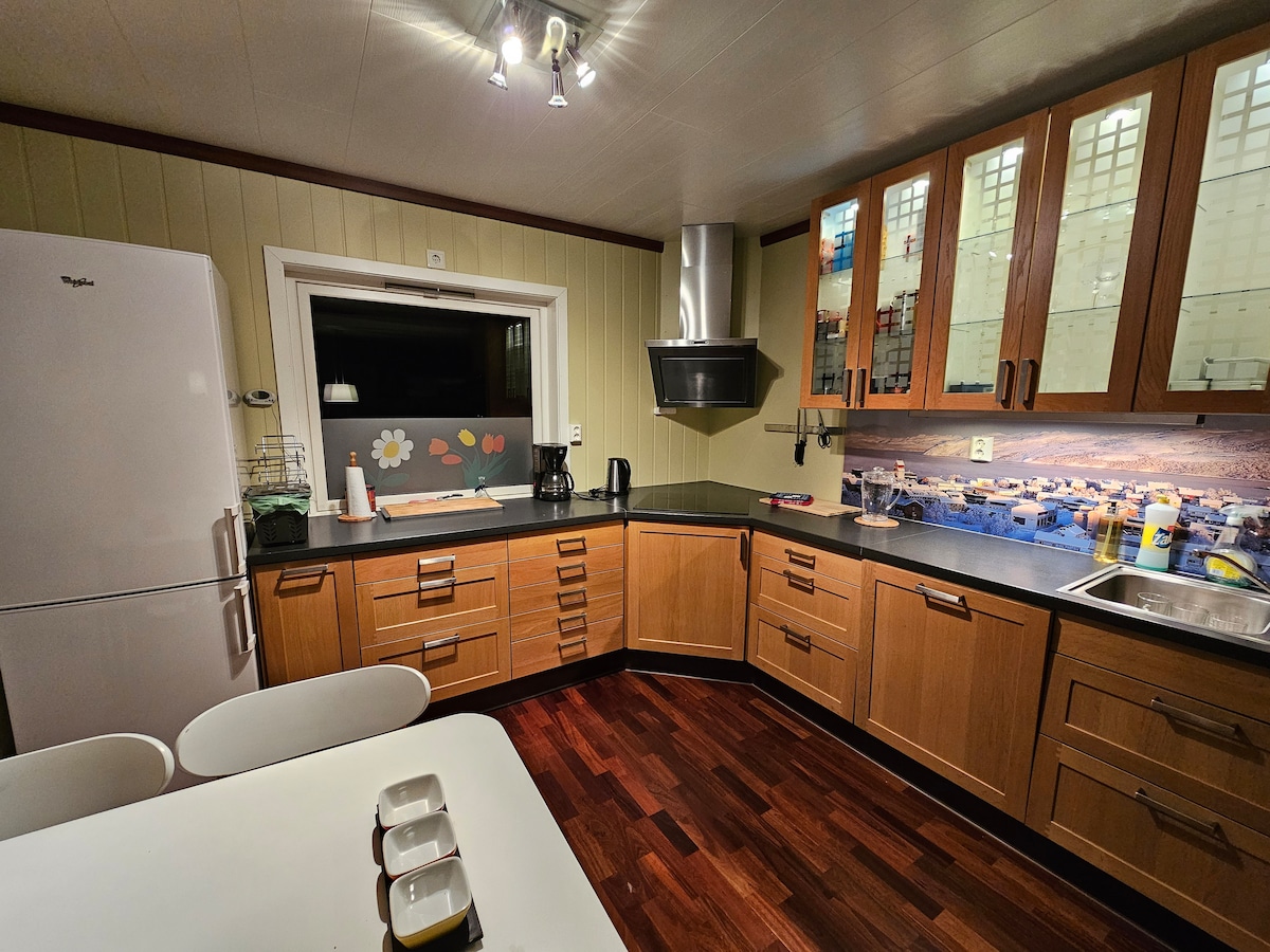 Casă mare, recent renovată, la aproximativ 600 m de centrul orașului, Hurtigruten și magazin alimentar. Living mare și masă cu spațiu pentru 8-10 persoane. Bucătărie bine echipată, baie cu duș și două toalete separate la etajul 2. Verandă mare, cu posibilitate de utilizare a grătarului cu gaz. 3 dormitoare cu paturi duble, posibil cu două paturi de o persoană într-una dintre camere. 2 dormitoare cu paturi de 120 cm. Unul are acces printr-o scară ușor abruptă.