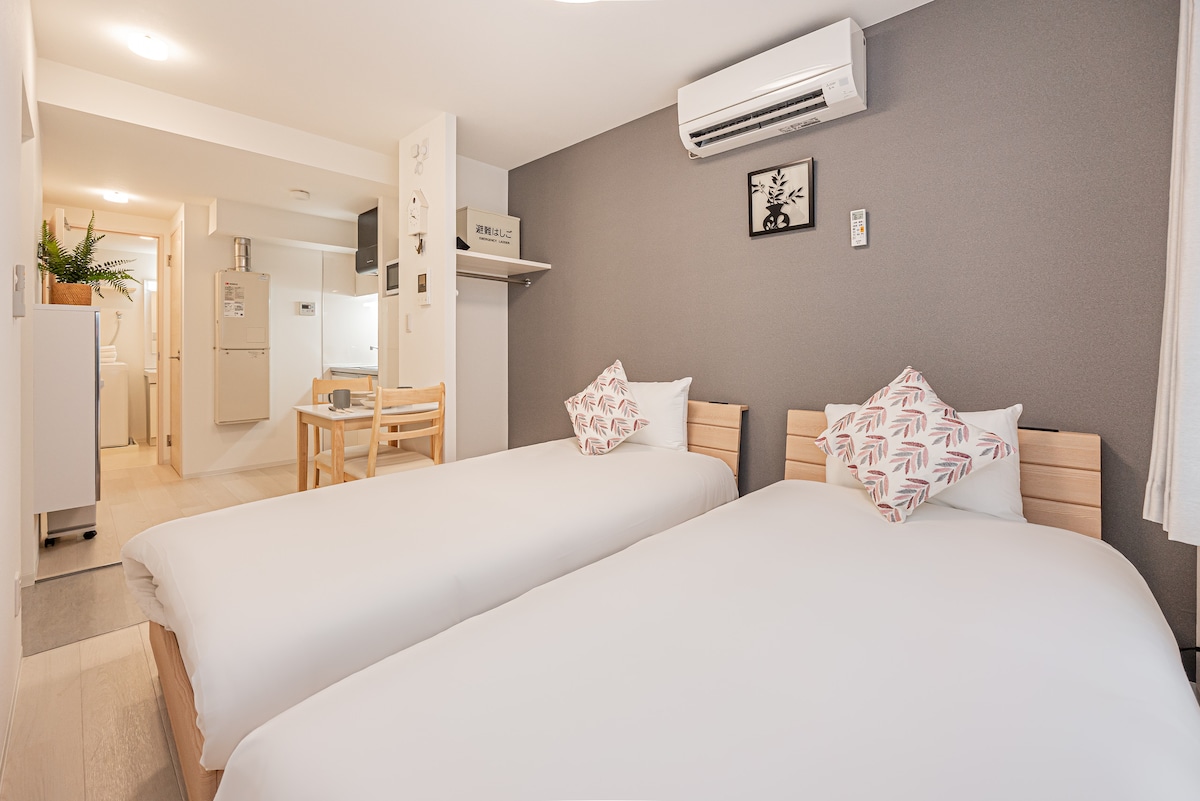 This is a spacious, sunny studio apartment (23㎡). While there is no elevator, it's on the second floor, so access isn't too difficult. The room stays warm even in winter. 2 guests (Double bed provided as standard; spacious and comfortable) 3 guests (May feel slightly cramped) Double bed and single bed provided. Check-in is at 2:00 PM, check-out at 10:00 AM. Early check-in may be possible if cleaning is finished ahead of schedule. Luggage storage is available from 11:00 AM.