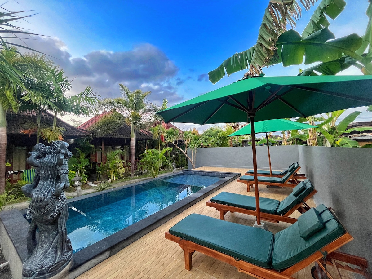 Stay in the heart of Nusa Penida, secluded within Bali's bird conservation, with flocks of birds singing over you! & surrounded by 100-year-old trees! Enjoy your stay in a unique-charming room with a pool, & outdoor-indoor shower! Only 200m from Nusa Penida's most famous area of restaurants, bars, and beach clubs & dive centers! Only a few walking distances to a pristine beach overlooking Mount Agung with beautiful coral scenery perfect for diving & snorkeling.