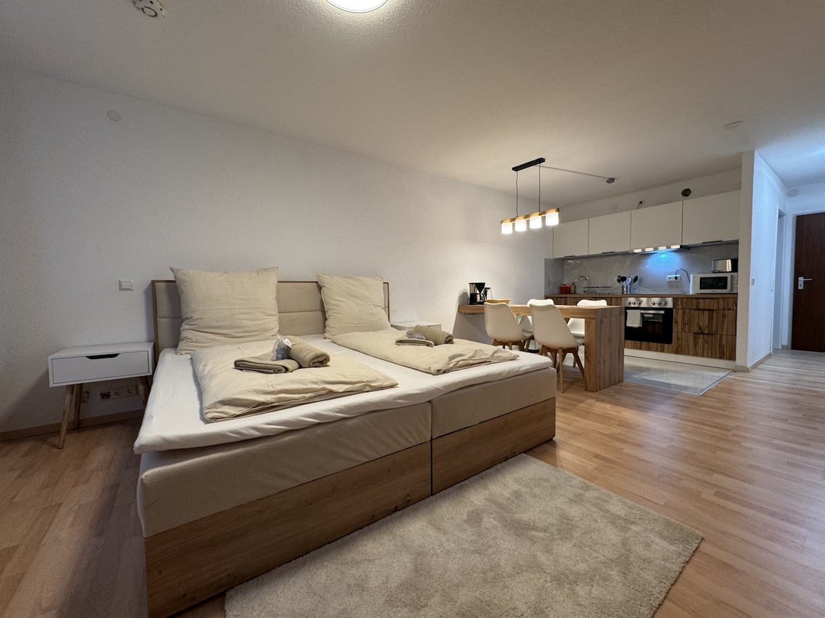 Aici, călătorii singuri sau cuplurile vor găsi un studio ideal. Mic, dar foarte confortabil . ! Este o cameră pentru living și dormit! Scufundă-te în lumea Pădurii Negre în apartamentul nostru recent renovat. Tavanul original vechi din grinzi din lemn emană confort rustic. Noua baie cu gresie retro se potrivește, de asemenea, perfect cu ambianța. De asemenea, ești binevenit să folosești sauna noastră (contra unei mici taxe) 1 noiembrie - 15 decembrie este 1x saună inclusă!