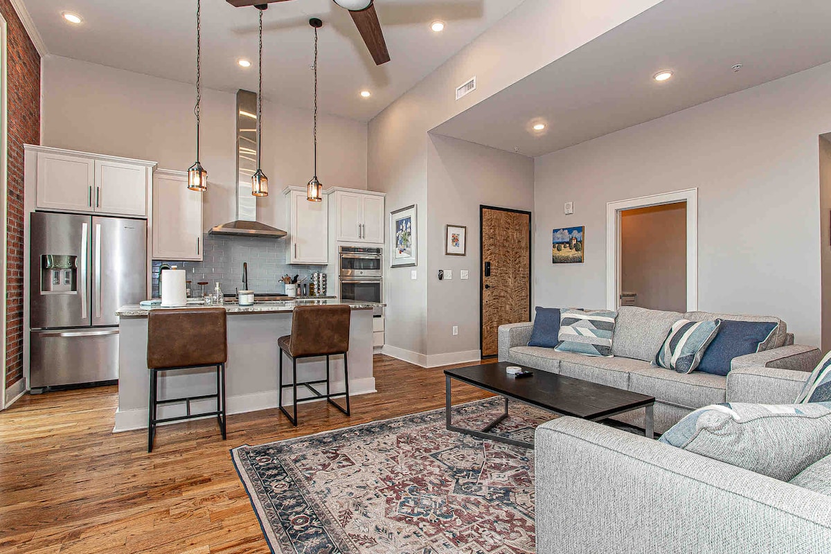 Farmecul istoric întâlnește eleganța modernă în acest penthouse urban de lux. Relaxează-te în zona de living cu concept deschis, cu cărămidă expusă și ferestre mari. Pregătește o masă în bucătăria bucătarului-șef și bucură-te de frescă la masa de luat masa în aer liber. Bucură-te de priveliștea panoramică a orașului Knoxville și de dealurile de dincolo în timp ce te relaxezi pe terasă. Adună-te în jurul gropii de foc din exterior și bucură-te de o băutură pe propria ta terasă privată pe acoperiș, sub stele.