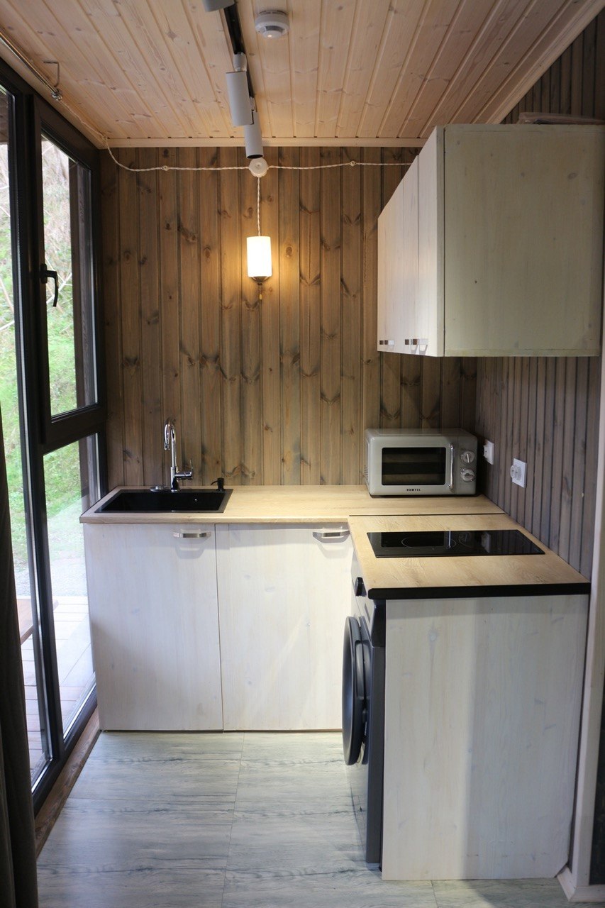 🏡 Dimensiune 🏕 Prețul include: ✔ Două dormitoare duble; ✔ Baie cu vedere panoramică; ✔ Bucătărie complet utilată; ✔ O mică bibliotecă; ✔ Verandă cu mobilier exterior și grătar; ✔ Saună - 50 GEL ✔ Narghilea - 40GEL
