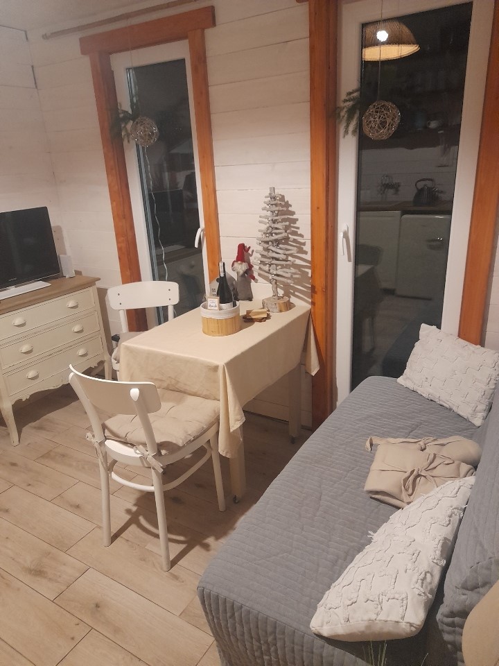 Cabana noastră din lemn a fost proiectată într-un mod modern și funcțional. Am încercat să ne cufundăm în mediul înconjurător și să nu deranjăm natura care ne înconjoară. Satul nostru mic nu a renunțat la timp și a fost ca înainte. Nu există magazine sau restaurante, nu există turiști, doar liniștea și natura. Satul este înconjurat de pajiști și Deșertul Piska până la cele mai apropiate orașe, la 10 km. Cranes și nenumărate păsări acvatice te invită la un spectacol zilnic, unde îți poți găsi liniștea.