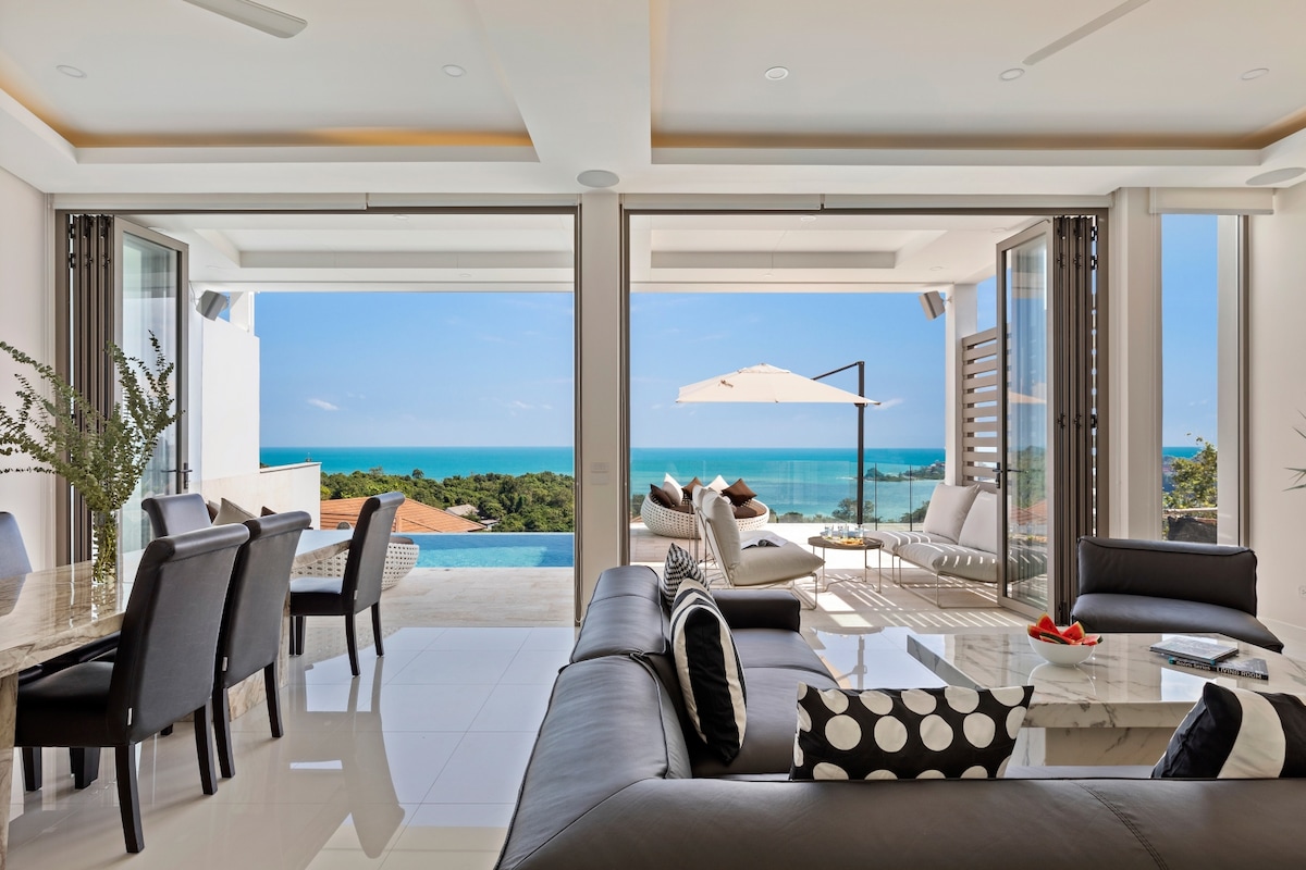 Bucură-te de o experiență elegantă în această vilă recent renovată, situată central, cu 2 dormitoare, cu unele dintre cele mai bune priveliști din Koh Samui. Cu o terasă pe acoperiș și o piscină infinită privată cu apă sărată 2 dormitoare 3 băi Parcare privată Piscină infinită privată Sală de fitness comună non-stop Wi-Fi cu fibră privată foarte rapidă Bucătărie mare cu cuptor, aparat de cafea, cuptor cu microunde, mașină de spălat vase Livingul și dormitoarele au televizoare inteligente Cadă cu hidromasaj Toalete automate japoneze Sistem de filtrare a apei pentru întreaga vilă
