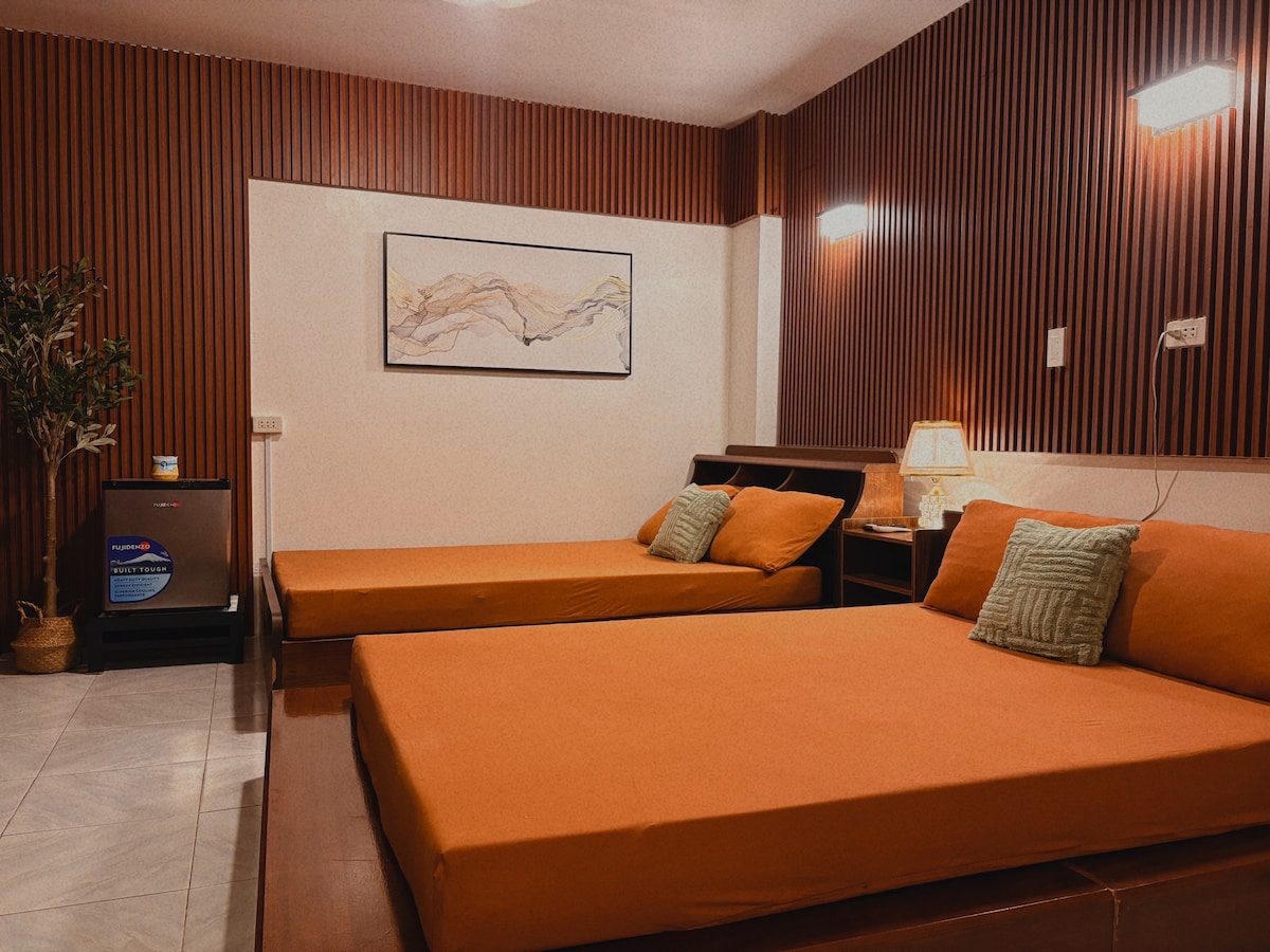 Elegant 1 bedroom, 2 double size beds with hot & cold shower, 2 units of aircondition, living area, kitchen with utensils, refrigerator, wifi, water dispenser and etc.