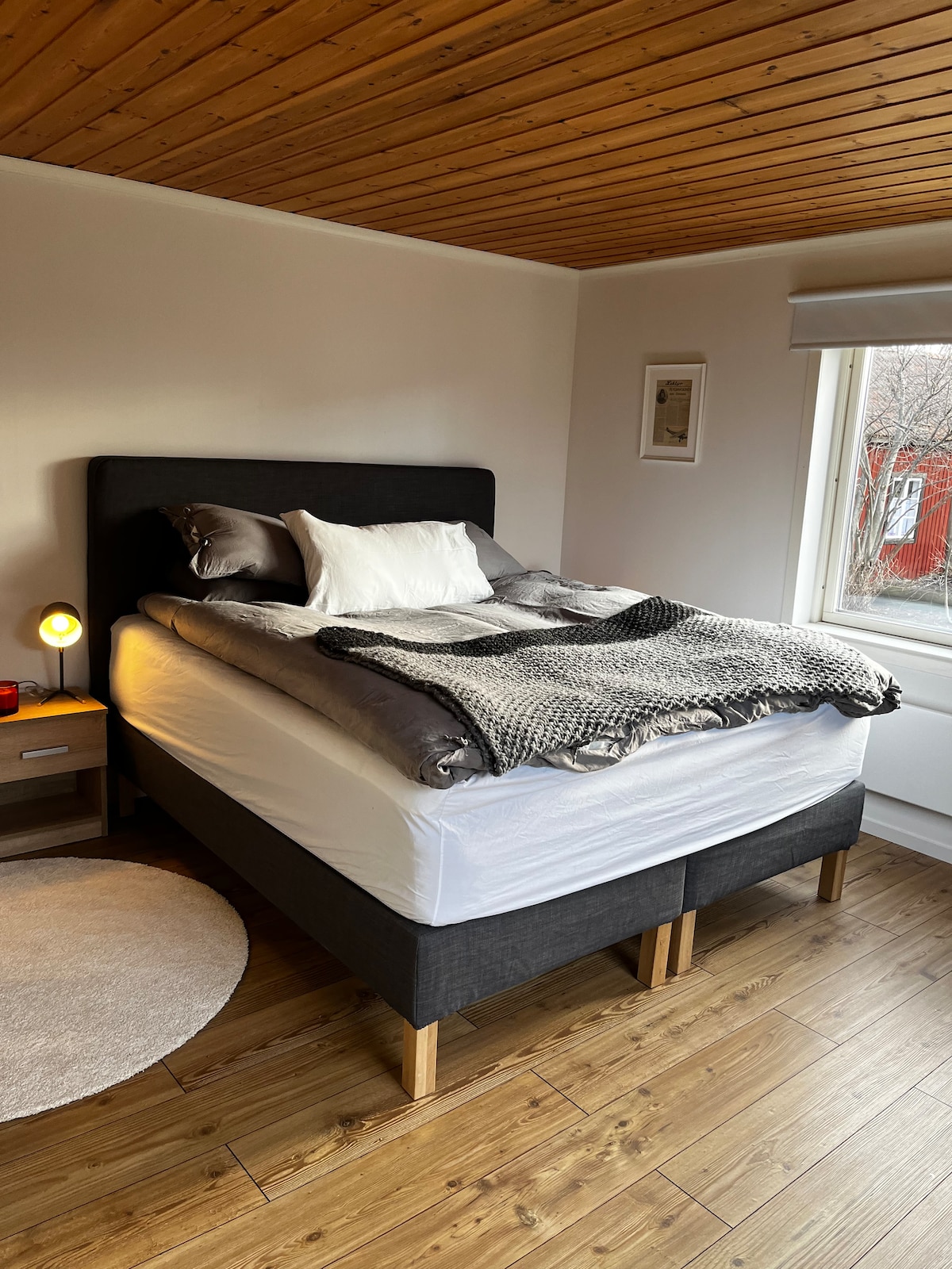 Acum, în sfârșit, închiriem noua noastră fermă renovată (pregătită 2022) unică, dacă o cameră și o bucătărie sunt distribuite pe 2 etaje. La parter este livingul/bucătăria, chicineta cu 2 arzătoare, cuptor cu microunde, filtru de cafea și frigider cu congelator. Masa cu loc pentru 4a. Baia casă bijuterie, toaletă, chiuveta cu bancă mare de depozitare și duș cu pereți de duș din sticlă. O scară în sus este dormitorul, 160 de paturi, o canapea mică și un fotoliu, precum și un televizor inteligent care se rotește. Ferma este situată în vechiul Gävle, în mijlocul centrului orașului, aproape de orice.