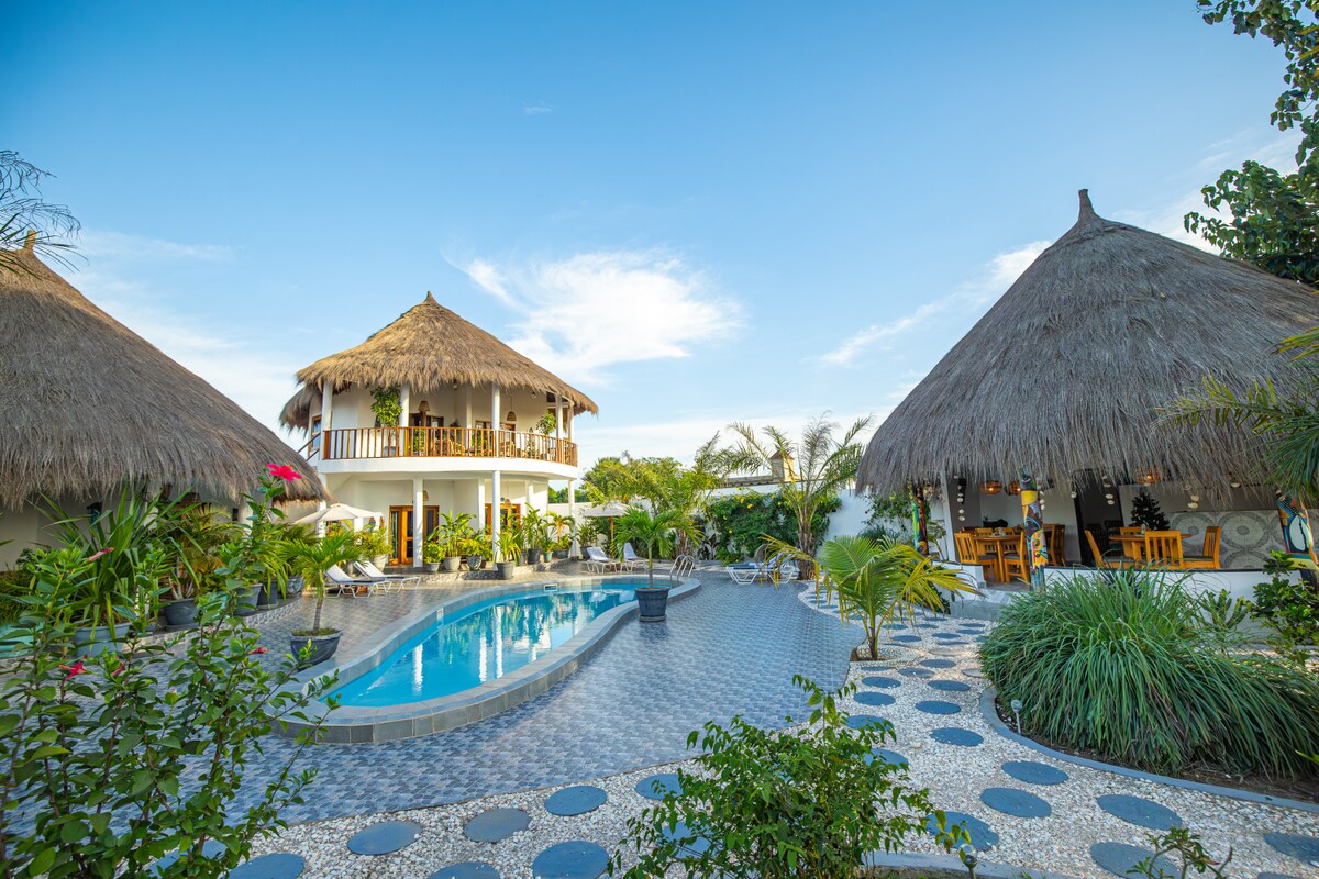 Casă de oaspeți gambiană frumoasă, autentică, înconjurată de propriile noastre grădini, copaci, flori și oameni drăguți. Situat în Tujereng, la doar câteva minute de plajă. Cazarea ta este situată într-un complex privat cu un restaurant/bar și un mic magazin, precum și casa mea privată. Indiferent dacă intenționezi să-ți petreci vacanța, să te relaxezi în intimitate sau dacă dorești ca localnicii să-ți arate cum este Gambia, Grădina Kachadulaa este alegerea perfectă pentru tine.