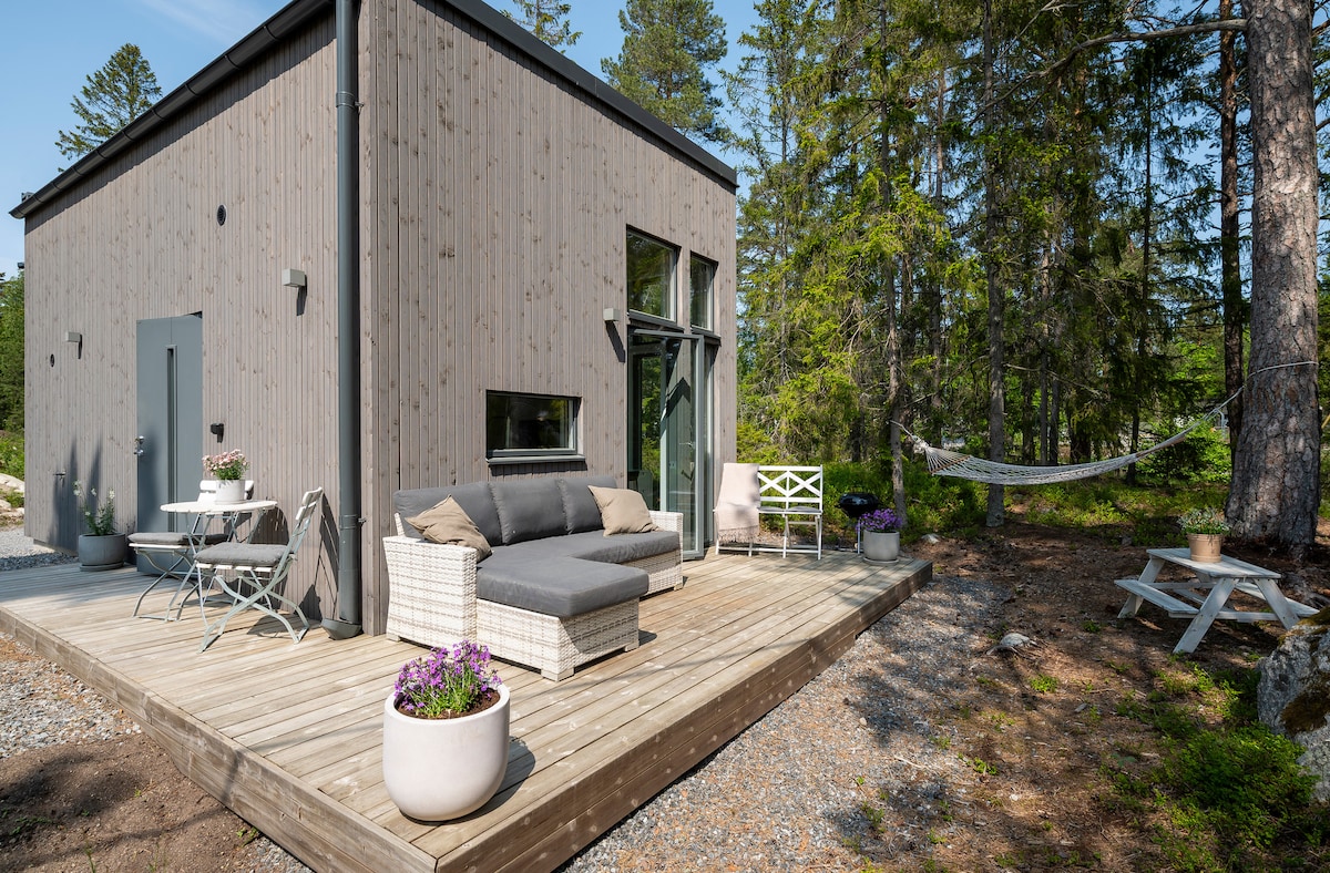 Căsuță confortabilă, vedere la lac și teren forestier, Värmdö