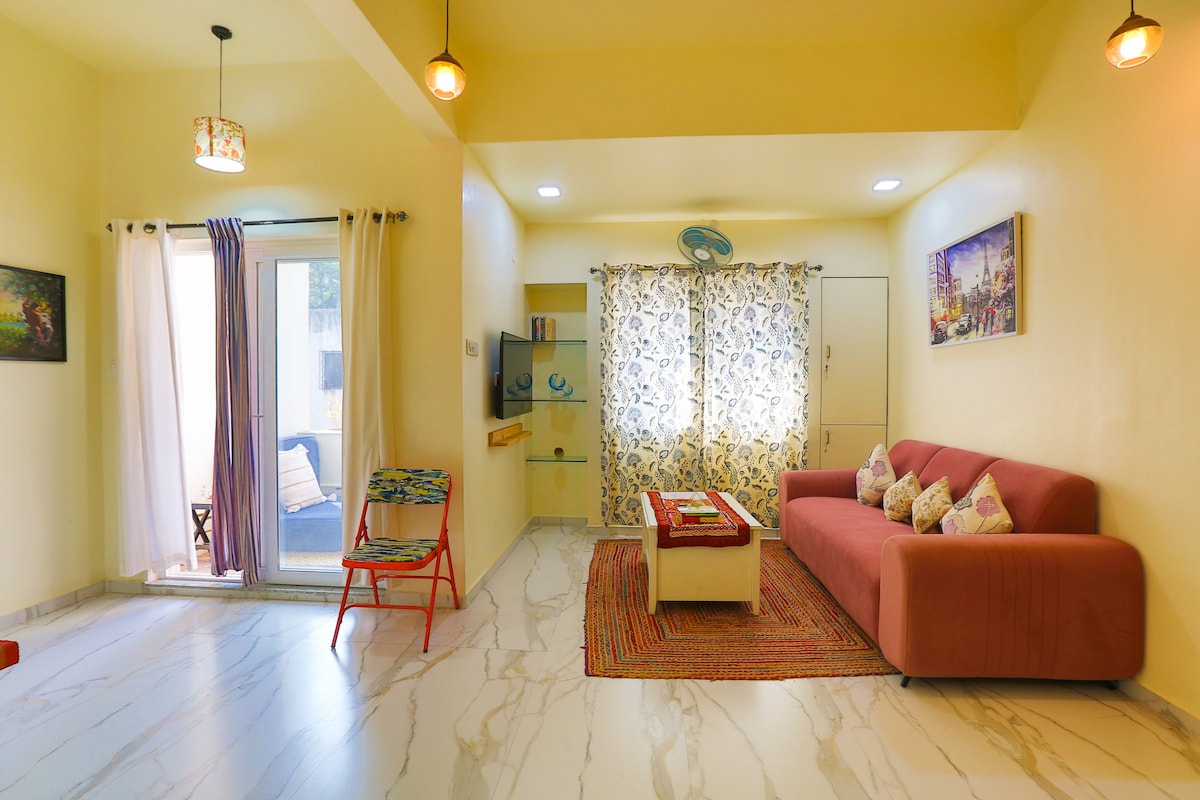Welcome to our brand-new, spacious 2-BHK apartment, ideal for families and couples seeking comfort and convenience. The bedrooms have queen size beds with orthopedic mattresses and AC for a restful night's sleep. Relax in the large living room with a 43-inch Smart TV, lightning-fast WiFi and a dedicated dining area. Comes with two super clean bathrooms stocked with bath essentials. The fully equipped kitchen includes high-quality appliances and crockery for your culinary adventures!