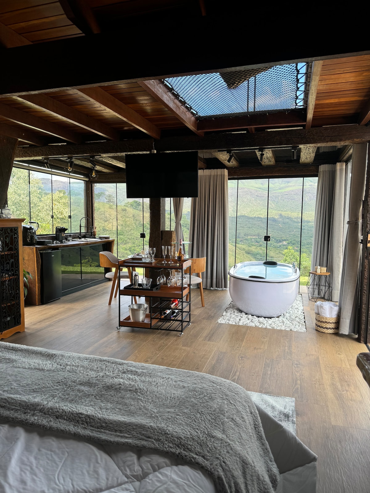 Chalé da Serra é sustentável onde arquitetura quebra barreiras entre interno e externo. Banheiro integrado às pedras centenárias com vista panorâmica, sauna privativa a vapor, rede suspensa para contemplação do Vale do Paraopeba. Fogão à lenha aquece a água do banho e cria atmosfera aconchegante, com vista 360° da serra. Para adultos, máximo 2 pessoas. Não aceitamos pets.