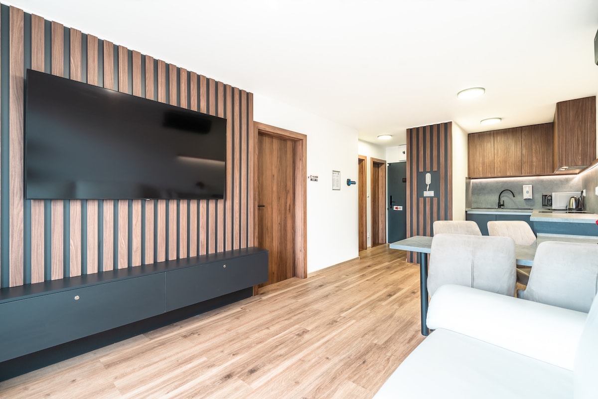 Apartamentul este făcut pentru oaspeții care caută combinația perfectă de poziție excelentă și dotări moderne. La doar câțiva pași de strada principală, restaurante, cafenele și monumente emblematice din Košice. Terasă spațioasă pentru micul dejun sau seară, stând cu prietenii sau familia, cu vedere panoramică la oraș. Mobilier modern și atenție la detalii pentru a oferi confort maxim oaspeților cu discernământ. Bucătărie complet mobilată, baie, Wi-Fi rapid și TV, mașină de spălat rufe și fier de călcat.