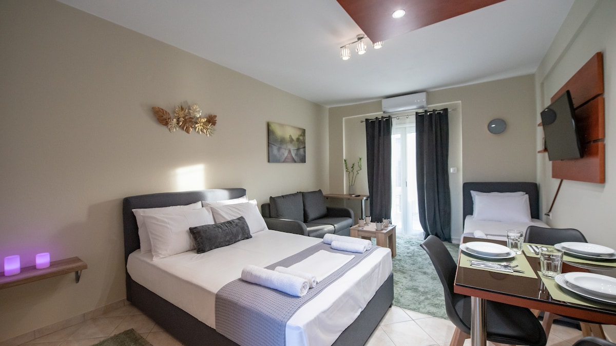 Studio fermecător (16,65 metri pătrați) cu o terasă mare,foarte aproape de centrul orașului. Un pătrat ,lângă stația de autobuz,supermarket și cuptor cu lemne. 10 minute de mers pe jos de centrul orașului și 15 minute de mers pe jos , centrul istoric! 5 minute de mers pe jos de lacul Ioannina!Bucătărie complet utilată,cafetieră și DVD player cu filme pentru cinematografe