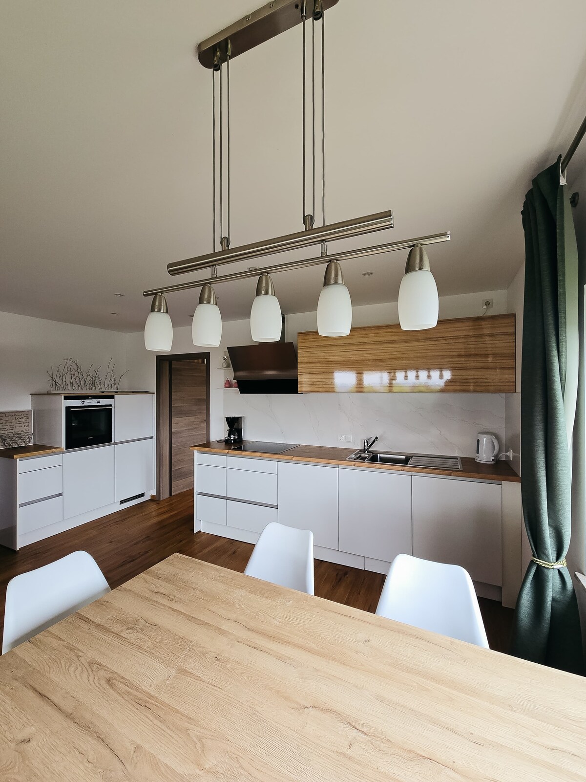 Apartament luminos de 120 mp la parter cu echipamente de lux Acces fără cheie Aer condiționat Șemineu interior Podele din lemn de esență tare Bucătărie echipată complet utilată 2 x cafetieră complet automată Pat XXL 200x200 electric Zonă de living XXL cu funcție de pat jaluzele automate Sală de soare Internet de 100 Mbit Seif Terasă cu bucătărie în aer liber La marginea orașului Marktheidenfeld 200 m de la drumul principal/pistă de biciclete Opțiune de încărcare Wallbox până la 22 kW 0,49 EUR/kW Închiriere biciclete montane 10 € pe bicicletă/pe zi