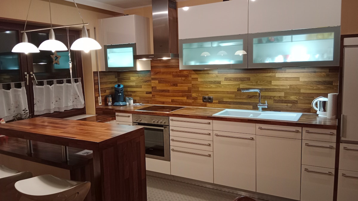 ⭐️„Nu mai derula, ai găsit locuința pe care o cauți.”⭐️ ✔️Lenjerie de pat și prosoape de înaltă calitate incluse ✔️Mașină de spălat și uscător gratuite ✔️Aer condiționat în toate camerele ✔️ Parcare gratuită chiar la casă ✔️ Bucătărie mare cu insulă de gătit și 4 scaune de bar ✔️ Super prietenos cu familia și copiii – paradisul copiilor ✔️Conexiune rapidă la Frankfurt/târg (Messe) ✔️ Curte/grădină privată cu poartă care se poate încuia ✔️ Wi-Fi super-rapid și toate serviciile de streaming Masă ✔️ mare pentru cel puțin 8 persoane