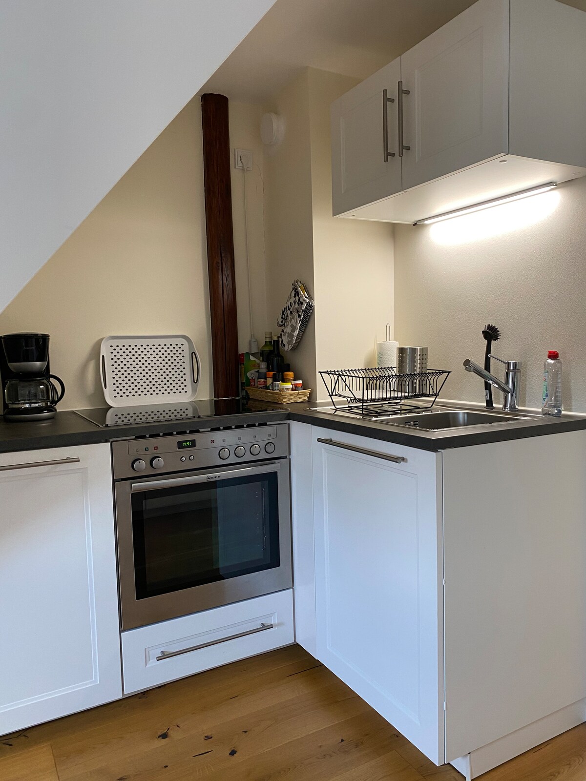 Situat central, renovat, apartament confortabil de sine stătător. Bucătărie cu frigider (inclusiv compartiment mic pentru congelator), cuptor, plită, cuptor cu microunde, ceainic, aparat de cafea și prăjitor de pâine. Baie la lumina zilei cu duș, WC, uscător de păr. Living/dormitor cu pat dublu (180x200), dulap, dulap cu sertare și canapea, masă, bancă TV cu televizor.