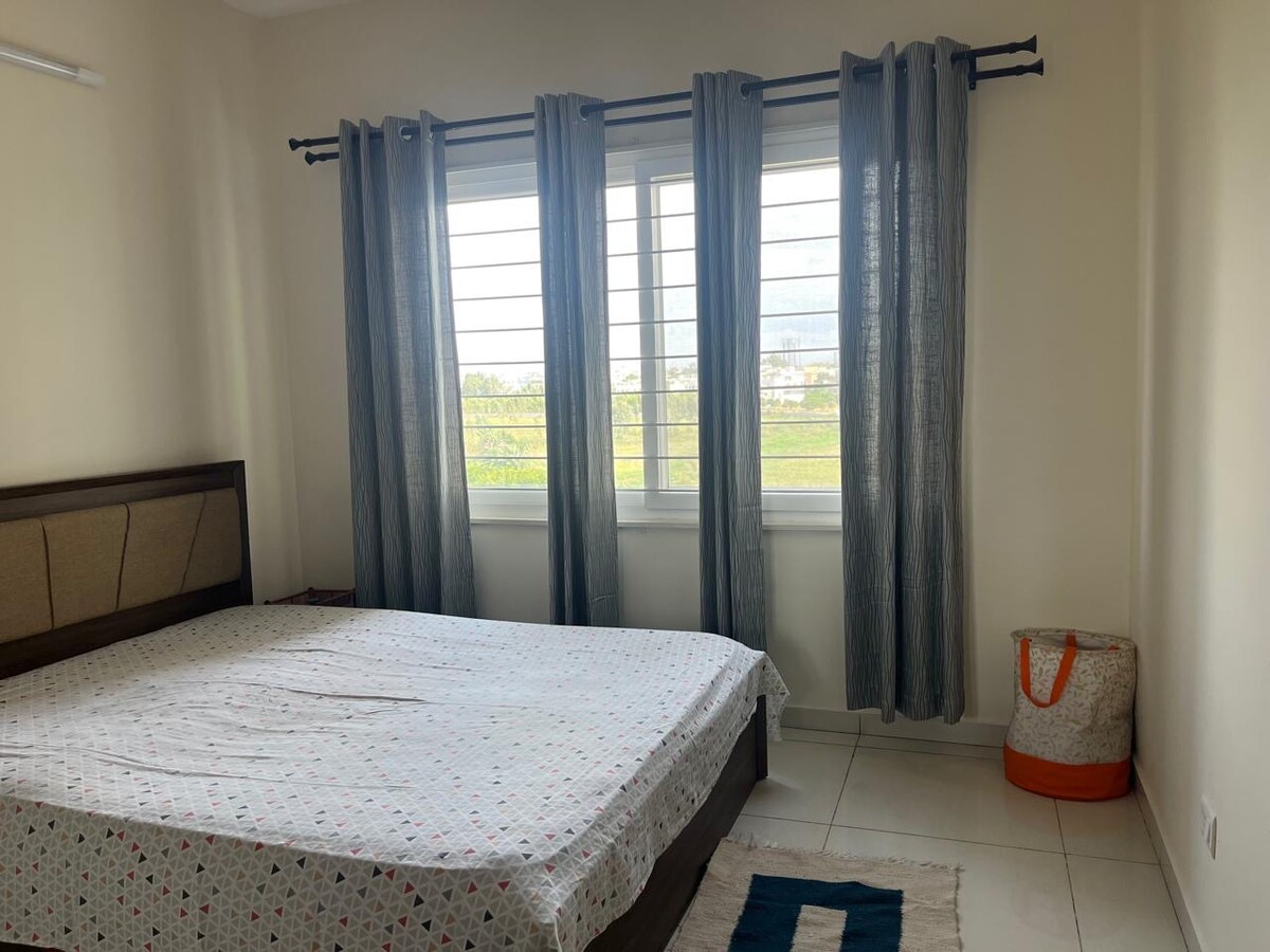 Bine ai venit în apartamentul nostru elegant și confortabil 3 BHK de la etajul 22 al Pashmina Waterfront din Battrahalli, K.R. Puram. Această reședință spațioasă oferă o bucătărie complet utilată, dormitoare confortabile și o zonă de living generoasă. Bucură-te de viața vibrantă a orașului chiar afară și profită de dotări precum un televizor cu ecran plat, Wi-Fi gratuit, parcare, lift și alimentare de rezervă.