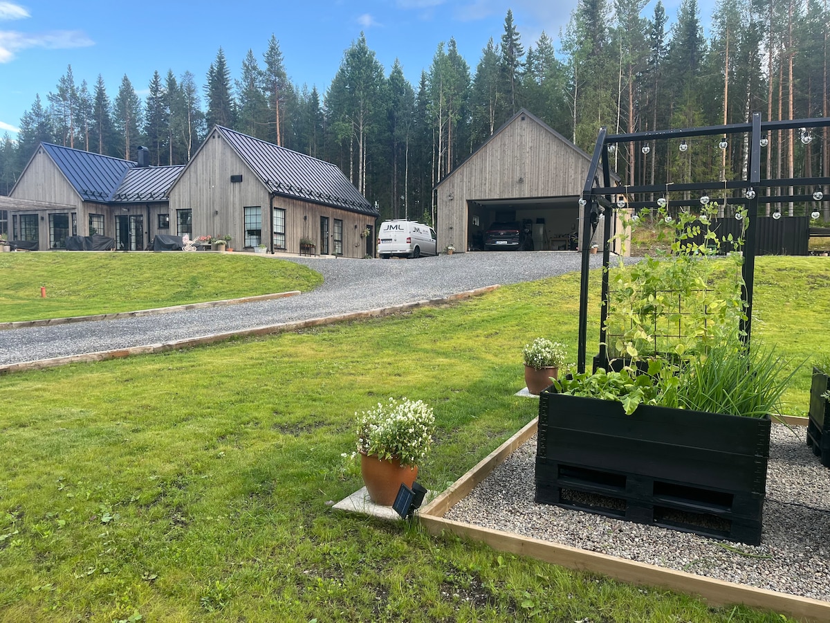 Our modern log house is situated right on a lakeshore. The open-concept design with lots of wood and light creates a warm, friendly atmosphere. On 85m2 you'll find panoramic windows with a fantastic view on the lake, a soap stone fireplace, two bedrooms and a bathroom. Enjoy fishing, paddling, swimming, hiking and x-country skiing right in front of your doorstep! Our neighbouring little farm with our kids, three sled dogs, three cats, a garden and chickens can induce a farm holiday experience.