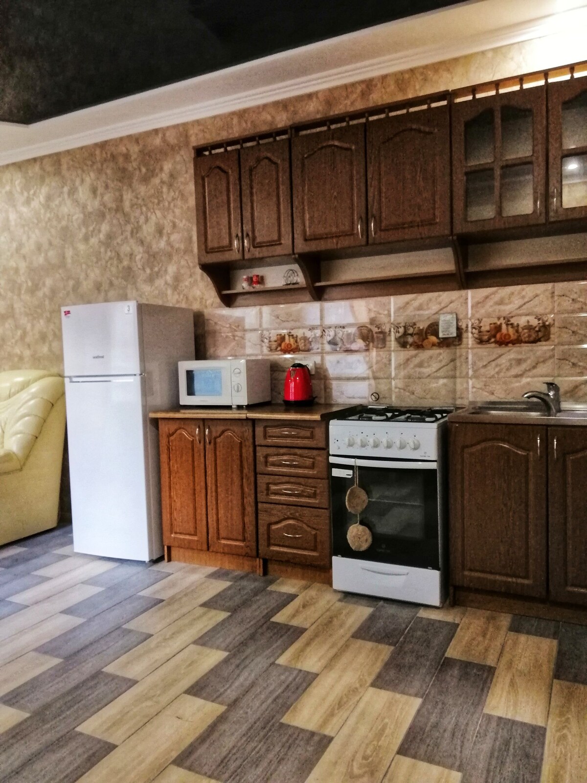 Apartamentul este situat în centrul orașului (5 minute de mers pe jos până la piața principală a orașului). Etajul 1/3 dintr-o casă din cărămidă. Un apartament frumos, foarte confortabil, luminos, cu un dormitor, cu renovare de designer. Apartamentul este echipat într-un mod familiar, are un pat dublu, o canapea de colț, un dulap cu sertare, o garderobă, un televizor cu plasmă, un șemineu, aer condiționat, încălzire autonomă, podea încălzită. Bucătăria este dotată cu mobilier de bucătărie confortabil încorporat, tejghea, scaune de bar confortabile.