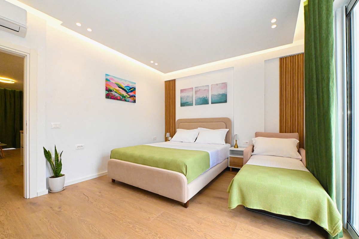Experimentează o lume a minunilor în timp ce te cufunzi într-o escapadă de vis pe coastă, oferind dimineți și apusuri de soare, cu o plajă privată la 1 minut distanță, cu vedere la Marea Ionică. Apartamentul nostru uimitor din Golful Bougainville oferă interioare spațioase și luminoase, împodobite cu tavane înalte, cu vedere uluitoare la mare. Proiectat de arhitectul familiei noastre, mama noastră, apartamentul se îmbină frumos cu împrejurimile pitorești ale florilor bougainvillea și plantațiile de măslini din Sarandë.