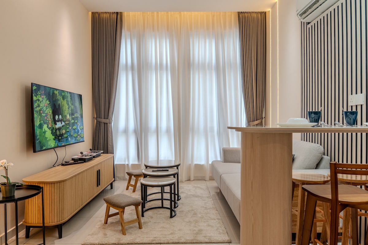 Apartament de lux privat | Mergi pe jos până la mallul KSL • Distanță de mers pe jos până la mallul KSL • Design minimalist inspirat de MUJI • Jacuzzi privat pentru relaxare • Cinema captivant cu sunet surround • Pat matrimonial cu saltea premium de 12 inch • Canapea de lux Concepută pentru confort, intimitate și lux liniștit. Ideal pentru cupluri, ocazii speciale sau oaspeți care caută o ședere rafinată și neîntreruptă în inima orașului Johor Bahru.