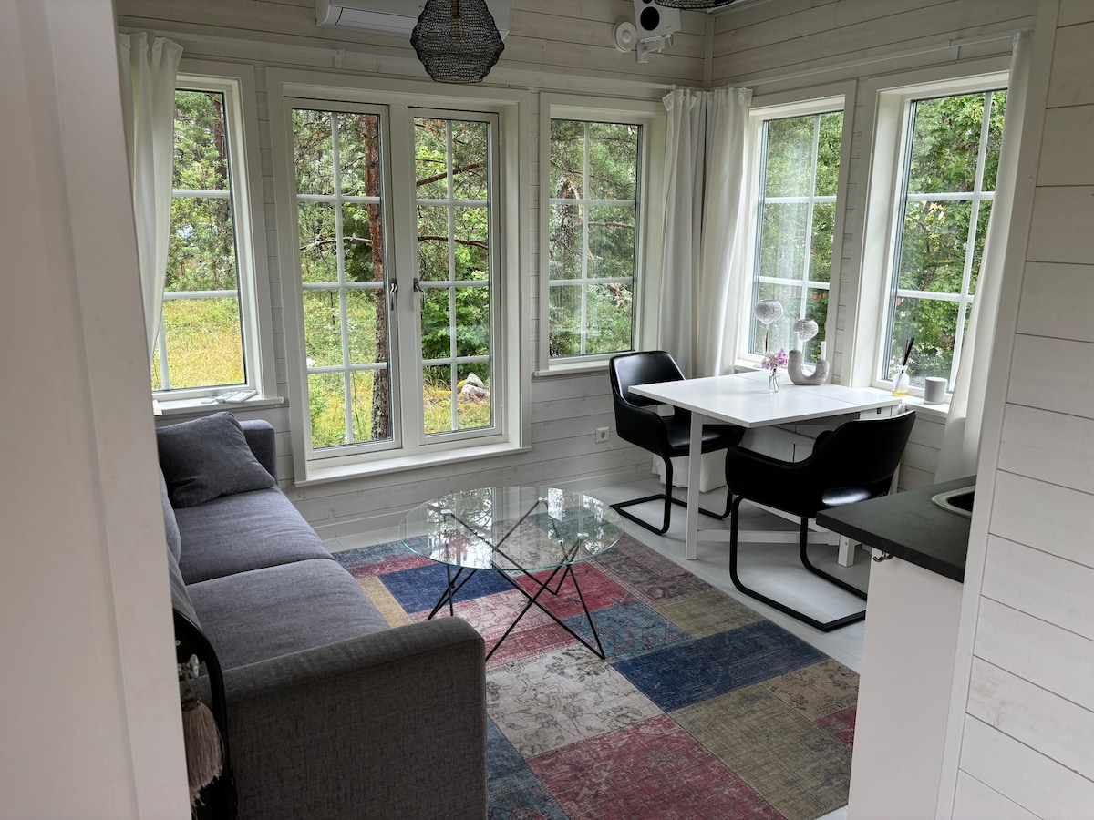 Cabană nou construită de 30 mp. 5 minute de mers pe jos de port. - Plan deschis, cu bucătărie și living într-una. - Mansardă de dormit cu 2 paturi single. - Livingul are o canapea extensibilă. - Bucătăria are plită cu inducție și cuptor. - Baie complet cu gresie, cu toaletă, duș și mașină de spălat rufe. - Terasă mare în jurul casei cu zonă de luat masa. - Priveliștea este formată din pădure de pini și afine - Curățenia nu este inclusă. - Animalele de companie nu sunt acceptate - Oaspeții își aduc propriile lenjerie de pat și prosoape (pot fi închiriate pentru 150 SEK de persoană)