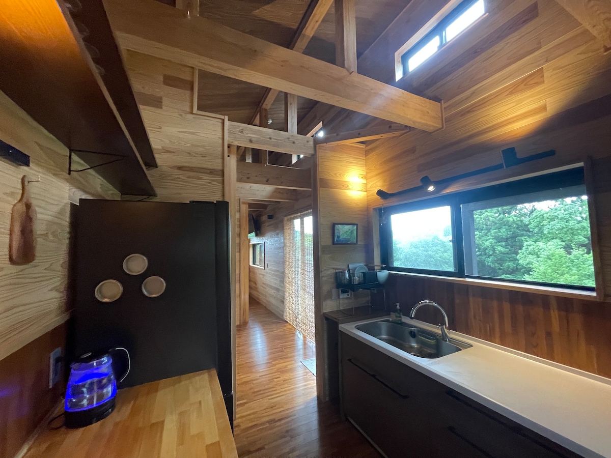 Această locație este un loc foarte liniștit și secret pentru casa de vacanță. Există o mică cameră Tatami, cum ar fi o cameră de ceai, pe care o poți folosi ca yoga, meditație etc. pentru timpul tău privat. Cu toate acestea, nu există facilități de bucătărie. Oferim o oală electrică,căni,veselă mică, frigider, cuptor cu microunde și prăjitor de pâine, astfel încât să puteți aduce ceva de mâncare etc. Există vedere la mare și pădure de la cabana de oaspeți. Cabana este făcută în stil japonez, cu lemn de cedru local aromat, grinzi deschise și ecrane Shoji.