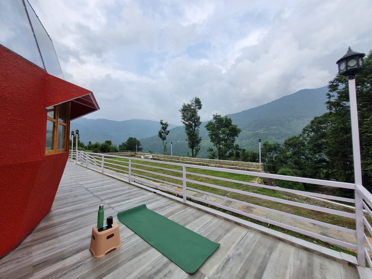 Îmbunătățește-ți experiența de camping cu o ședere în cupola noastră luxoasă de glamping de lângă lacul Naukuchiatal! Înconjurat de uimitorii munți Himalaya, cupola noastră unică oferă un amestec unic de lux și aventură. Trezește-te la sunetele naturii și petrece-ți zilele explorând peisajul uimitor din Himalaya. Fă o drumeție pe traseele din jur, mergi cu barca pe lac sau pur și simplu relaxează-te și bucură-te de împrejurimile liniștite.