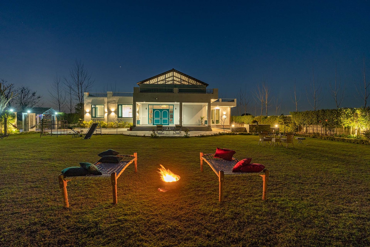 Situată la o fermă din Kurukshetra, această vilă este pe bună dreptate numită The Hideout Farms pentru locul său exclusivist, departe de mulțime. Este un spațiu luminos și fericit pe care ai vrea să-l răsfeți pe tine și pe cei dragi pentru un timp de calitate împreună. Piscina te va face să te stropești toată ziua, iar gazonul este imens, așa că și unele jocuri în aer liber ar fi distractive! Obține o experiență unică la fermă cu plimbările cu căruciorul Bullock, plimbările cu tractorul și activitățile agricole.