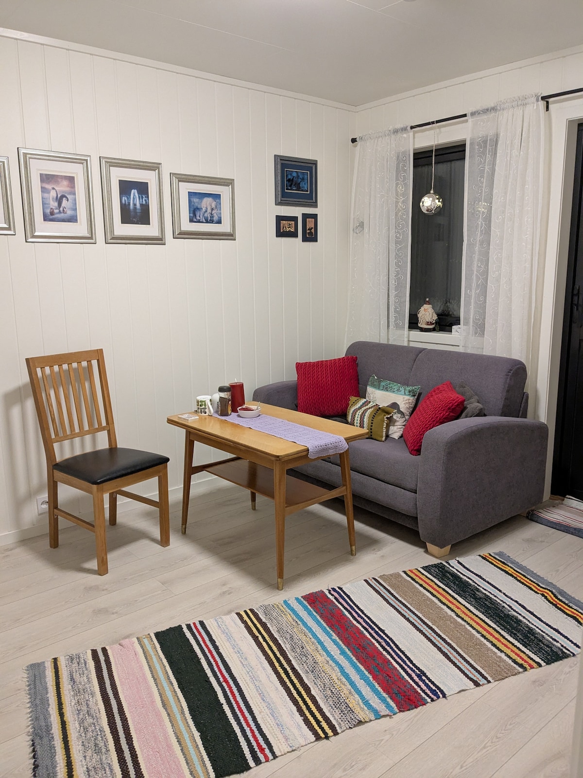 Apartamentul a fost finalizat în vara anului 2023. Este luminos și modern și constă dintr-o bucătărie cu toate facilitățile, un living cu zonă de canapea și TV, o baie cu duș mare, un hol și un dormitor cu pat de 150 cm. Toate camerele au o fereastră cu vedere la zona portului Hammerfest, Melkøya și Håja. Apartamentul se află pe o stradă laterală fără trafic, la doar 5 minute de mers pe jos de centrul orașului. Din păcate, nu avem parcare deoarece strada este prea îngustă.