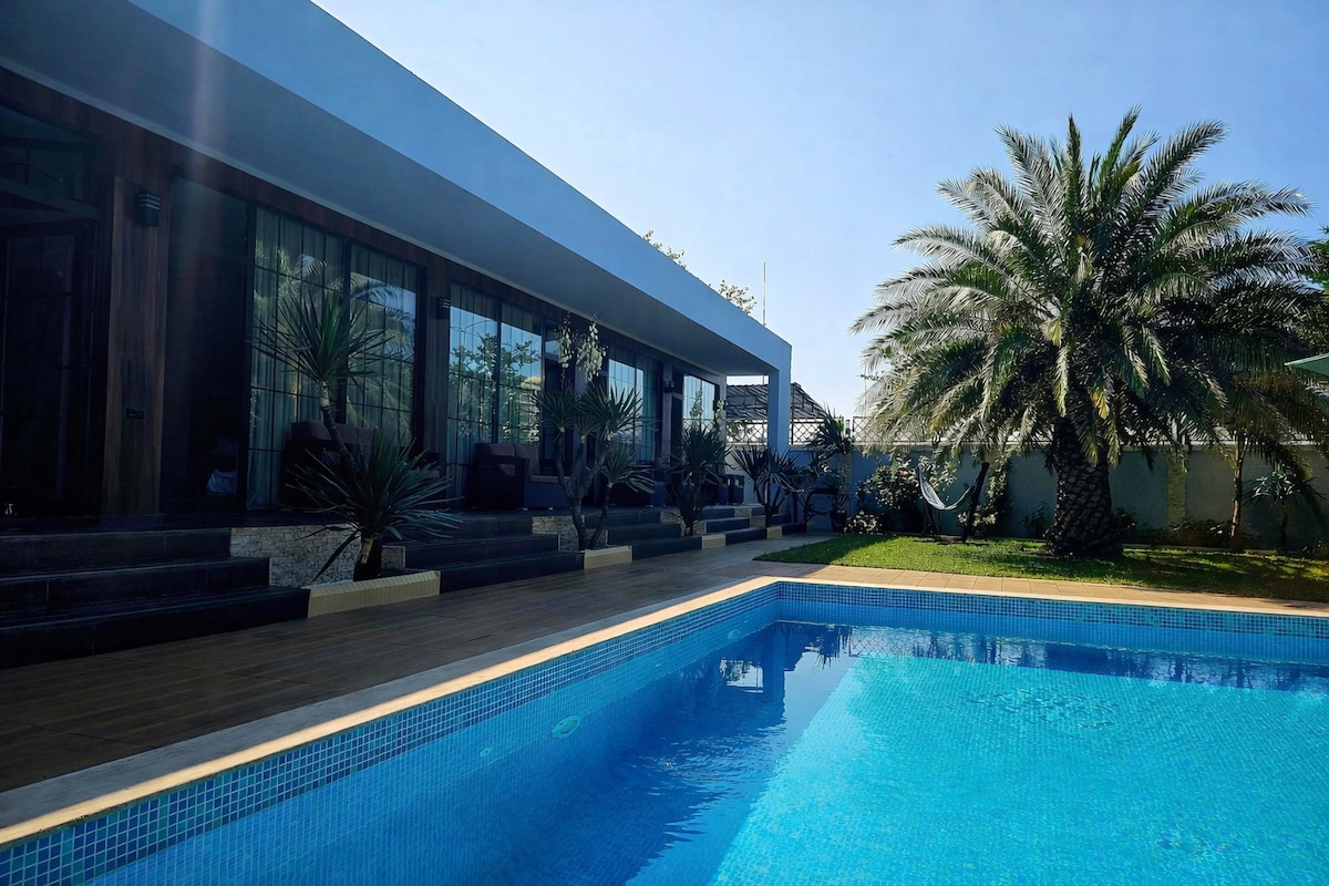 Private pool villa for up to 10 guests, just 250m from Batumi’s New Boulevard and the Black Sea. Enjoy complete privacy — no visibility from neighbors — with a lush garden, BBQ area, and modern outdoor space. The villa includes 4 bedrooms + an additional sleeping area in a living room, each with its own bathroom and kitchen access. Fully equipped with AC, WiFi, TV, washer, workspace, and private parking. Perfect for families or groups looking for comfort, privacy, and a premium seaside stay.