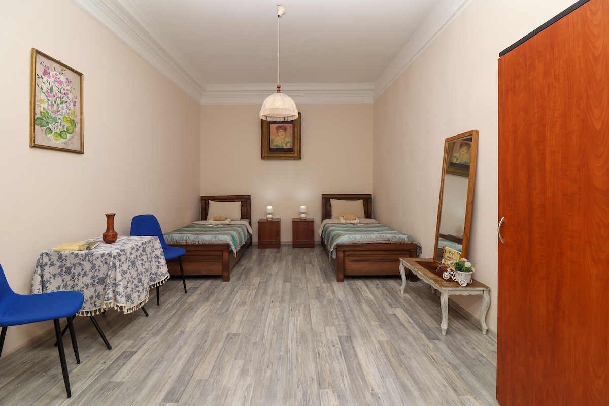 Proprietatea este situată la etajul 2 al curții italiene. În 1 dormitor. Are 2 paturi, o măsuță de cafea, un dulap . Aer condiționat. Există lenjerie de pat și un prosop curat. În 2 camere( bucătărie) există un pieton, ustensile de bucătărie, mașină de spălat, gaz, apă caldă și rece, ieșire în baie din cameră . Există tot ce îți trebuie. Această curte este vizavi de Biserica Sfintei Treimi. Gazda gătește delicios, poți comanda micul dejun. Așteptăm oaspeții, putem comanda micul dejun