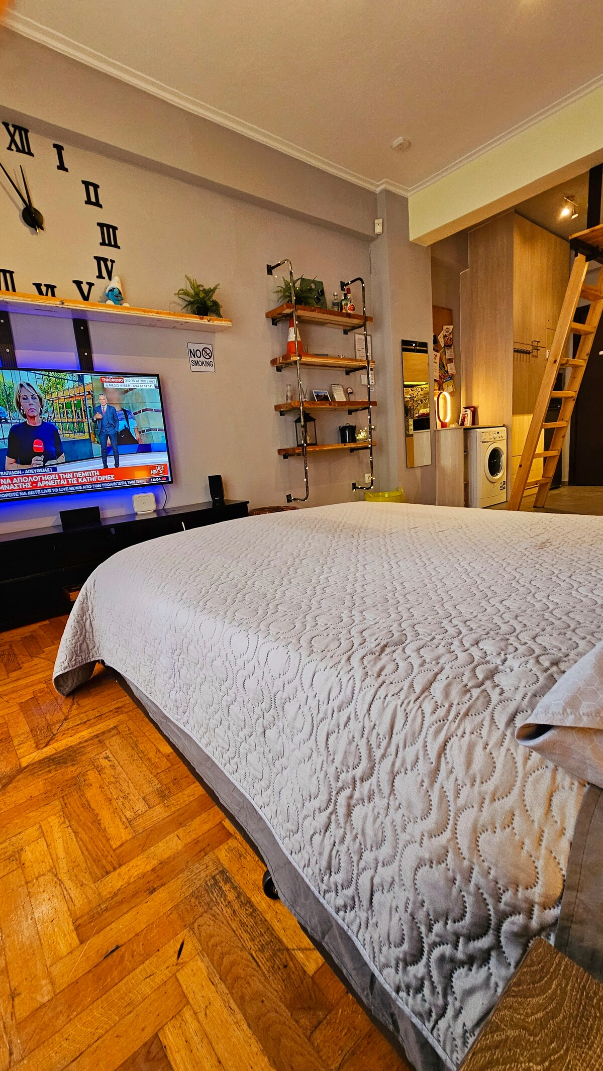 Descoperă confortul unui apartament studio de 30 mp în inima Atenei. Acesta are 2 paturi de dimensiuni normale, unul ridicat lângă tavan. Pentru divertisment, studioul oferă două televizoare de 55" Smart TV și un Smart TV de 32". Bucătăria este complet echipată cu aragaz ceramic, aparat de cafea și cuptor cu microunde, ideale pentru pregătirea meselor. O mașină de spălat este, de asemenea, disponibilă pentru confort. Aceasta este o locuință inteligentă complet echipată, cu integrare Google Talk, oferind o experiență fără probleme și modernă pentru șederea ta.