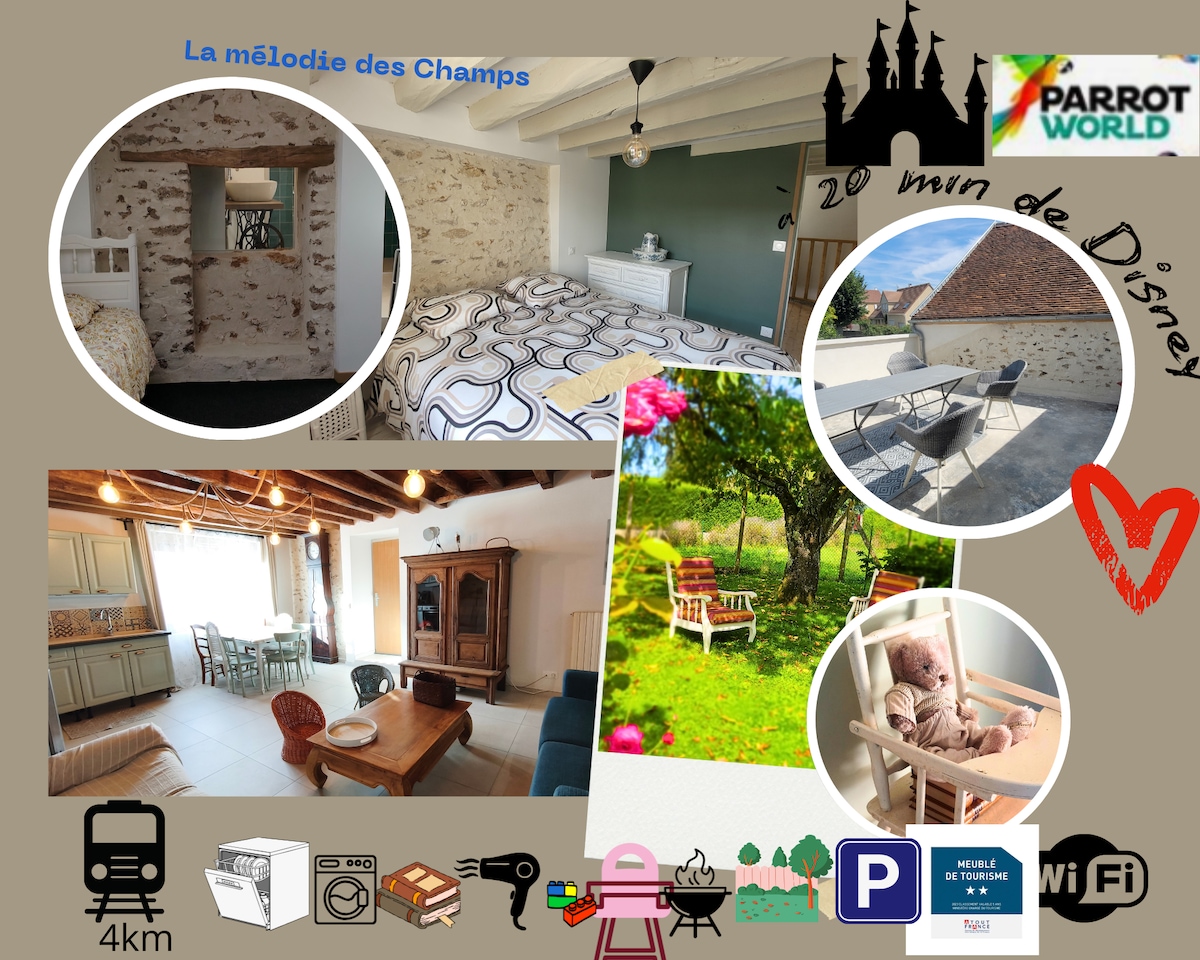 Cazare confortabilă complet independentă într-un sat fermecător din Briard. Luxul calmului peisajului rural, care vă permite să vă bucurați de acces la Disneyland, Village Nature sau Parc des Félins în 15/20 de minute sau Paris cu acces direct cu trenul în sat. Mic dejun de bun venit oferit. Dacă vii cu trenul, te putem pune în legătură cu 1 șofer VTC cu care avem un parteneriat.