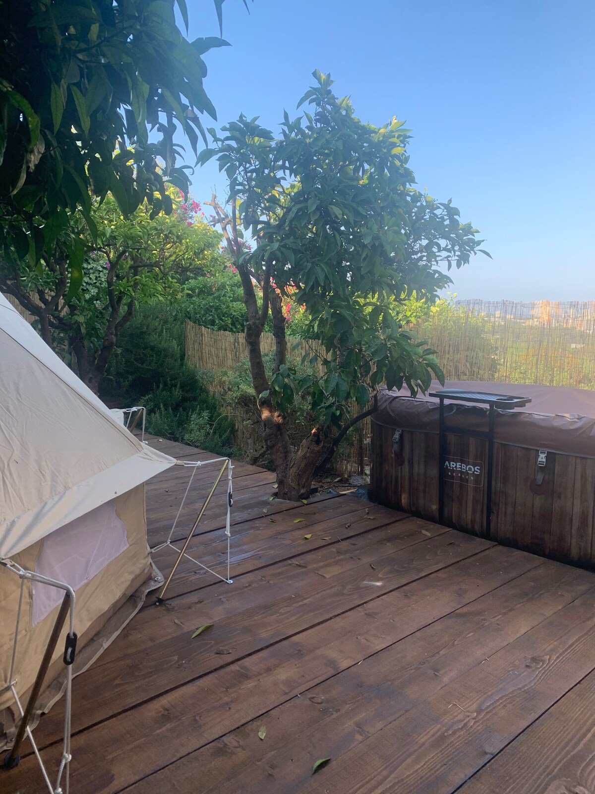 Laissez vous tenter par une nuit insolite en Lodge tente safari tout confort avec jacuzzi privatif et vue mer. Situez sur un emplacement privatif avec terrasse et jacuzzi chauffé. Petit déjeuner inclus. Au coeur de notre exploitation de BIGARADIERS, sans vis à vis malgré la proximité avec notre maison, vous disposez d'une indépendance totale, entrée et espace privatif. Vue mer Inoubliable sur la baie. Place de parking gratuite Petite salle de bain tout confort, douche et WC traditionnels