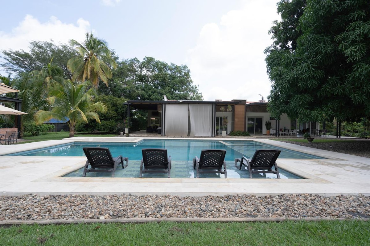 Această frumoasă ascunzătoare tropicală se află în inima câmpurilor de trestie de zahăr din Columbia, la doar 2 ore de mers cu mașina de Bogotá. Proprietatea este perfectă pentru familii și grupuri de prieteni, cu mult spațiu pentru relaxare și destindere. Casa este înconjurată de grădini tropicale luxuriante și are o piscină mare, perfectă pentru a se răcori într-o zi călduroasă. Există, de asemenea, o zonă de grătar cu vedere la râu, unde îți poți găti propriile mese sau te poți bucura de un grătar pregătit de bucătarul din incintă.