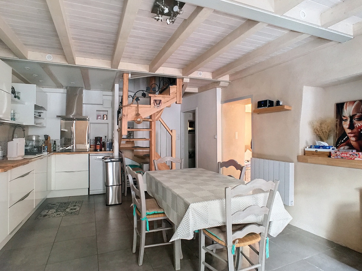 În inima satului medieval și pietonal Montbrun, pe înălțimile Gorges du Tarn, în Parcul Național Cevennes, această casă renovată combină farmecul lumii vechi și confortul modern. Oferă o bucătărie utilată, living, duș, toaletă separată și un dormitor spațios la etaj. Pereți groși pentru izolație optimă, înălțime mare sub bolți și decor sobru. Aragaz pe peleți și încălzitor cu convector. WI-FI TV HD CU FIBRĂ OPTICĂ. Perfect pentru iubitorii de drumeții și liniște.