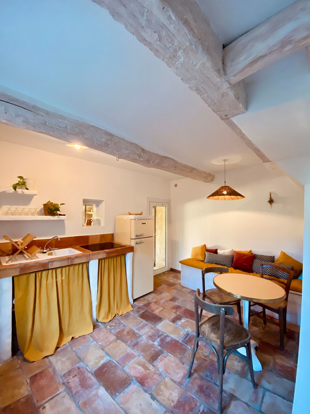 Închirierea este situată în La Motte d 'Aigues (84), într-un mic sat provensal din Luberon. La parterul unei case din sat, studio de 18 m2 complet renovat. Bucătărie deschisă spre camera principală, baie cu toaletă. Garsoniera este dotată cu o canapea extensibilă cu 2 locuri, TV, măsuță de cafea, bucătărie echipată (plită cu inducție 2 focuri, frigider congelator), blat cu scaune de bar. Intrare separată pe o alee îngustă. Geamuri duble, încălzire electrică. Wi-Fi