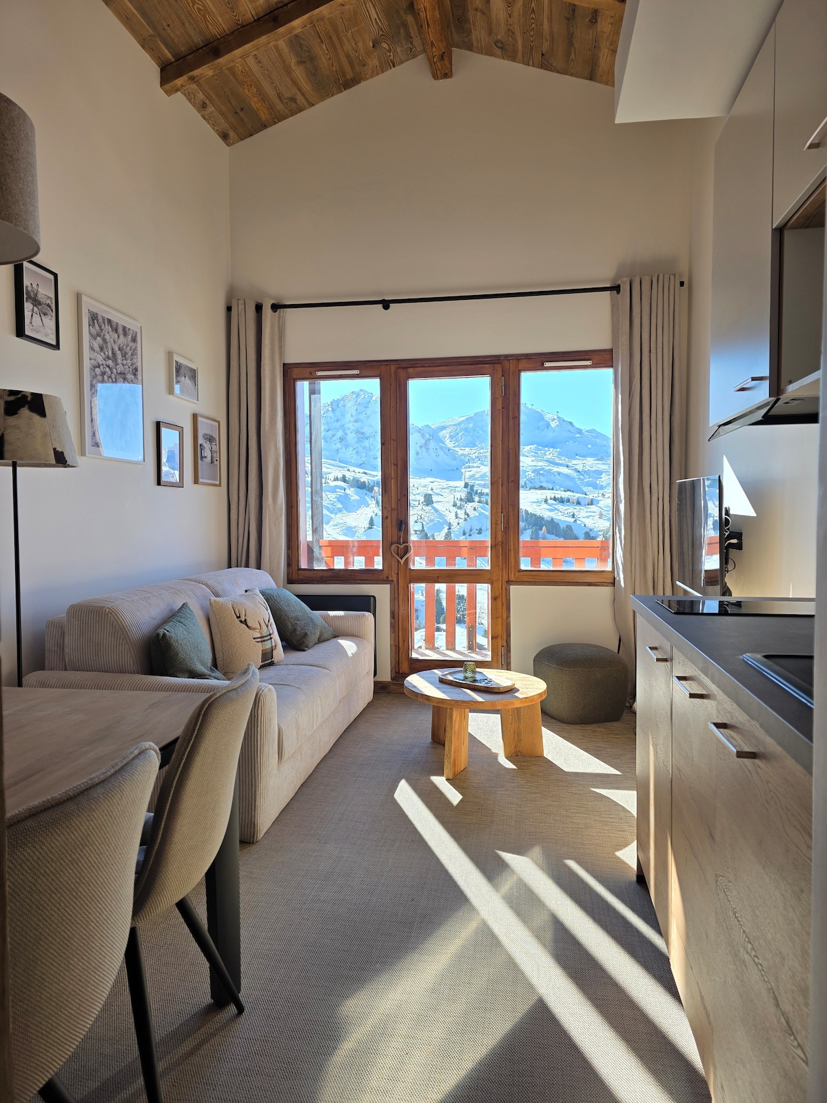 Belle-Plagne, la o altitudine de 2100 m,... cel mai căutat sat din La Plagne. Locație excepțională, la etajul 5 și ultimul etaj al reședinței Themis Schi, priveliști uluitoare de 180° ale munților și întregii zone de schi. Cu fața spre sud, apus de soare excepțional. Apartament de 27 m2 echipat pentru 4 persoane. Este posibil să închiriezi un apartament de lux O'2100M alături pentru 6 persoane suplimentare, pentru un total de 10 persoane