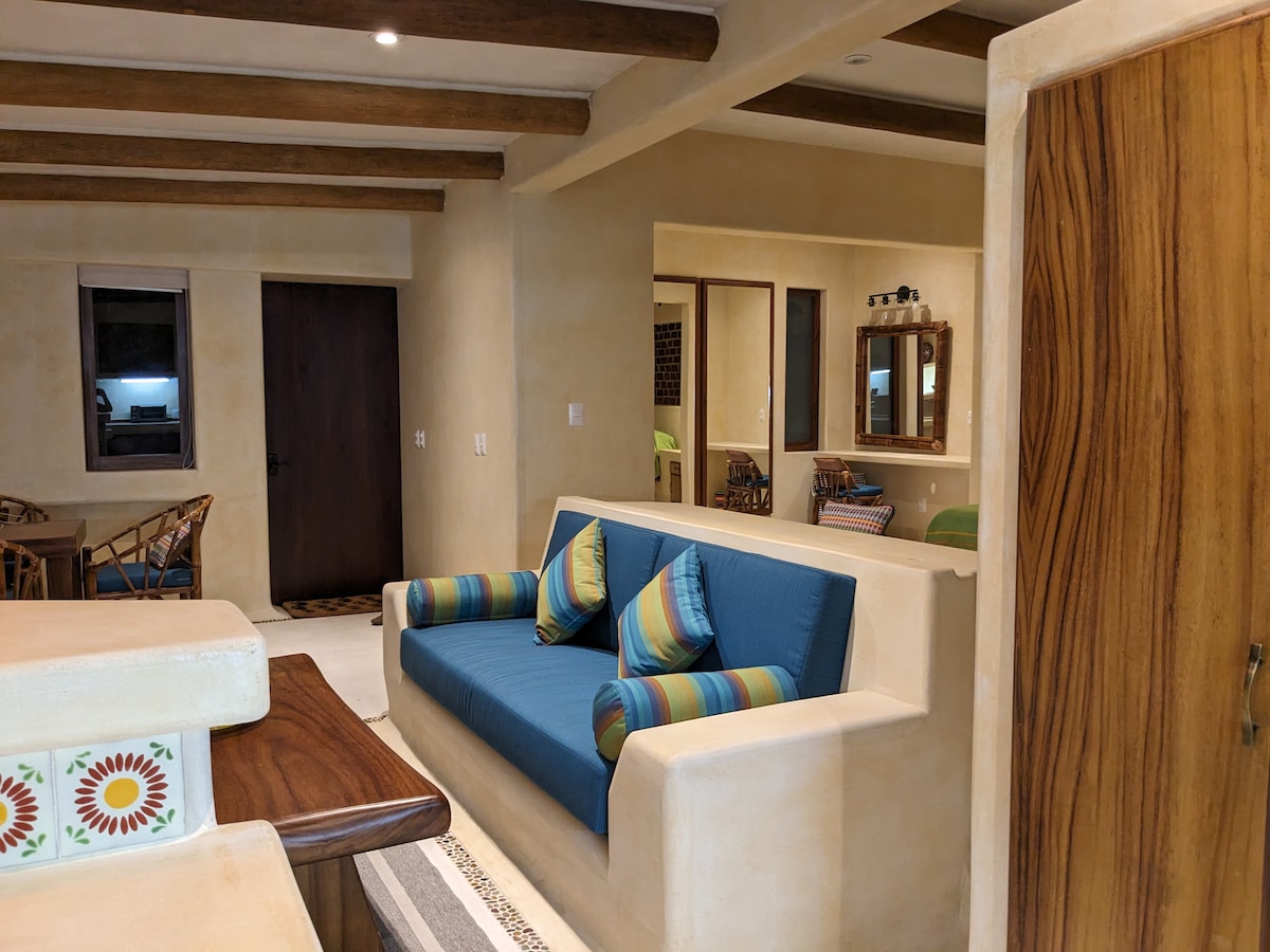 Un apartament independent mobilat luminos, cu vedere la vegetația tropicală din cartierul La Ropa Beach. Dispune de spațiu independent de luat masa/chicinetă, cu multă ventilație, un dormitor cu aer condiționat și pat matrimonial și o baie privată cu cadă. Lenjeria de pat săptămânală și schimbarea prosoapelor sunt incluse. Apartamentul Nanche este situat la un nivel superior al El Tamarindo la complexul familial Casa Calamondin, Colonia La Ropa.