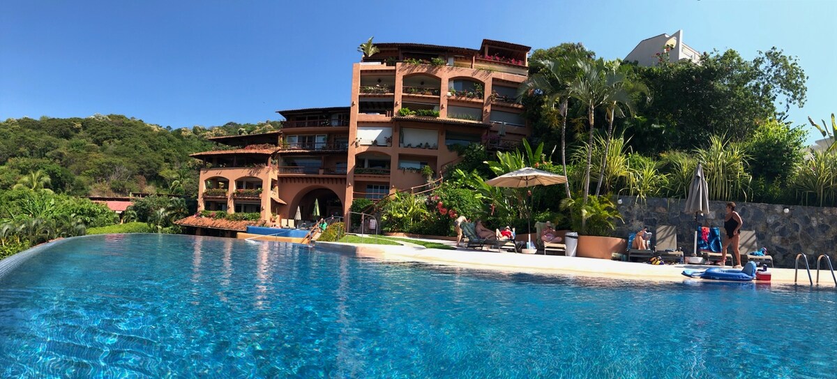Bine ai venit în studioul nostru confortabil din Zihuatanejo! Acest spațiu luminos are un pat matrimonial „King”, baie completă, o chicinetă bine echipată pentru confortul tău. Bucură-te de cafeaua de dimineață sau de apusurile de soare de pe balconul privat cu vedere la frumosul golf Zihuatanejo. Fă o baie în piscina infinită, plimbă-te până la Playa La Ropa, aflată la doar câțiva pași. Perfect pentru cupluri sau persoane care doresc să se relaxeze și să exploreze zona. Rezervă-ți șederea și experimentează paradisul! Câini mici acceptați: câini sub 9 kg bineveniți!
