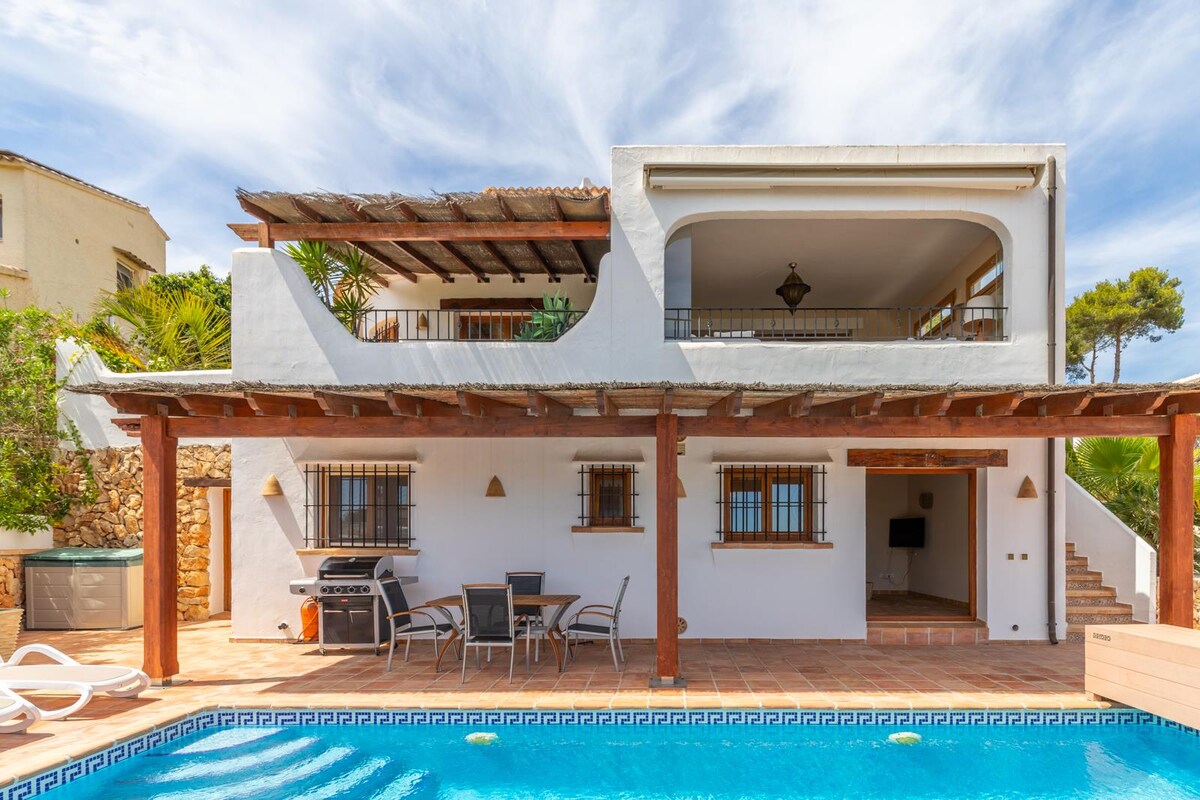 „Villa Sunset Moraira” - Bucură-te de zile de vis într-o vilă modernizată în stil spaniol pentru până la 8 oaspeți. Punctele principale: - piscină privată (cu încălzire) - zonă mare în aer liber cu vedere spre sud - Bucătărie în aer liber cu grătar - aer condiționat, ventilatoare și încălzire în toate camerele - mobilier de înaltă calitate - 3 dormitoare cu paturi box-spring - 2 băi moderne cu duș și cadă - bucătărie complet utilată - Wi-Fi rapid - Smart TV - locație liniștită, aproape de plajă ☆ „Vila lui Clio este o bijuterie absolută!”
