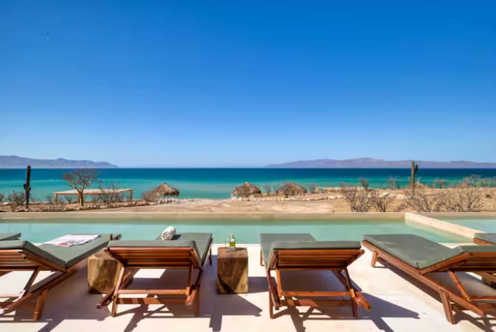 Your eco-chic paradise facing the Sea of Cortez. This sustainable home offers two bedrooms (king and queen), sofa beds, hammocks, and a private pool. It features a full kitchen, workspace, fast Wi-Fi, and a TV. Enjoy a terrace with lounge chairs, a fire pit, a grill, and a kayak. Direct beach access, free parking, and 24/7 security. Experience unique sunsets and responsible comfort: book your coastal escape now! Premium bedding, flexible check-in, and personalized attention to your experience.
