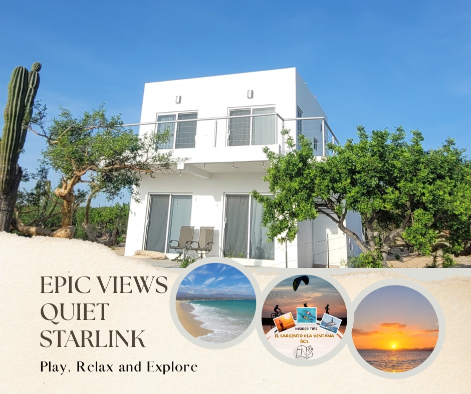 Wake up to front-row sunrise views over the Sea of Cortez— panoramic, unobstructed views of the bay, island and desert mountains. This eco-friendly second-floor retreat offers a cozy 2-bed, 1-bath layout with a fully equipped kitchen, breakfast bar, and a bright living room that opens to a furnished balcony—your private perch for morning coffee, ocean breezes, and stargazing. Just 7–10 minutes to beaches, kitesurf, sea safaris, cafés, hot springs, biking, and yoga. Enjoy fast Starlink WiFi.