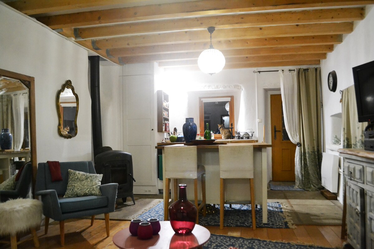 T2 (42 m²) indépendant, au-rez-de chaussé d'une maison en rénovation. Charme et confort: chauffage poêle à bois (élect seulement en complément), cuisine équipée, lave-linge, tv + lecteur dvd/cd, Wifi, petite épicerie et linge de maison intégralement fournit. Hameau à 750 mètres d'altitude, maison exposée plein sud. Emplacement privilégié pour les amoureux de la nature, calme ( peu de passage de voiture). Grande terrasse ensoleillée, confortable (chaises, canapé, barbecue) face aux montagnes.