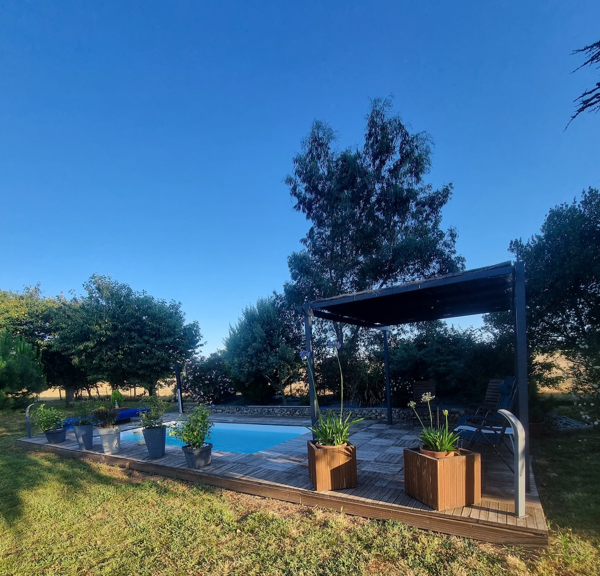 Nous proposons un gîte idéal pour quatre personnes. Le logement est climatisé. –une pièce de vie avec cuisine équipée (four, plaque céramique, réfrigérateur congélateur, lave-vaisselle, micro-onde, lave-linge), espace repas et salon avec téléviseur. – Une chambre avec un lit double - Une chambre avec deux lits simples –À l'extérieur : terrasse spacieuse dans un cadre verdoyant avec piscine partagée avec les propriétaires, salon de jardin, barbecue, transats. Un parking est à votre disposition.