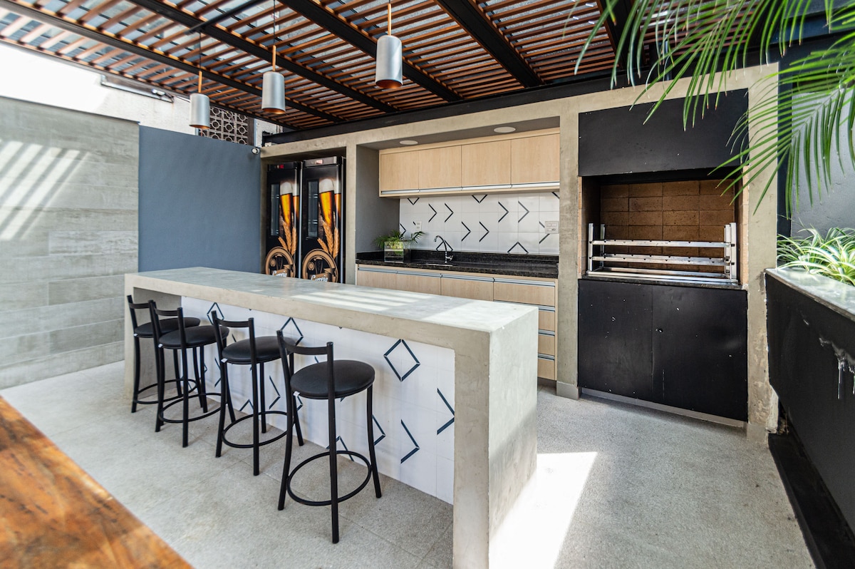 Casă de lux încrustată în piatră unică, cu priveliști uluitoare spre Serra da Cantareira. Complet echipat și cu aer condiționat, cu decor sofisticat, șemineu, bibliotecă, spațiu de lucru exclusivist, terasă cu jacuzzi, grătar. Suită principală romantică cu cadă panoramică. Liniștea și securitatea unui apartament în complex rezidențial închis. Notă; Pentru fotografii și înregistrări comerciale, te rugăm să ne contactezi prin Airbnb pentru valorile și regulile aplicabile.