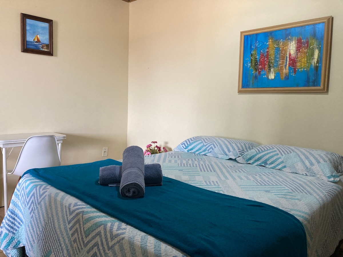 Mansardă cu intrare separată, completă. Aragaz, frigider, aer condiționat, cuptor cu microunde,ventilator, pat dublu, fier de călcat, dulap , masă/scaune, uscător de rufe. Ustensile, mix, storcător de fructe, aparat de făcut sandvișuri, lichidificator, cuptor electric, copac de orez, filtru de apă, prosoape, cearșafuri, pături, Smart TV. la 10 minute de mers pe jos de UFSC și 5 de UDESC. Stație de autobuz 30 m care duce la centru, plaje, universități Două blocuri de mall,farmacii, restaurante, supermarketuri cu benzinării La zece metri de spălătorie