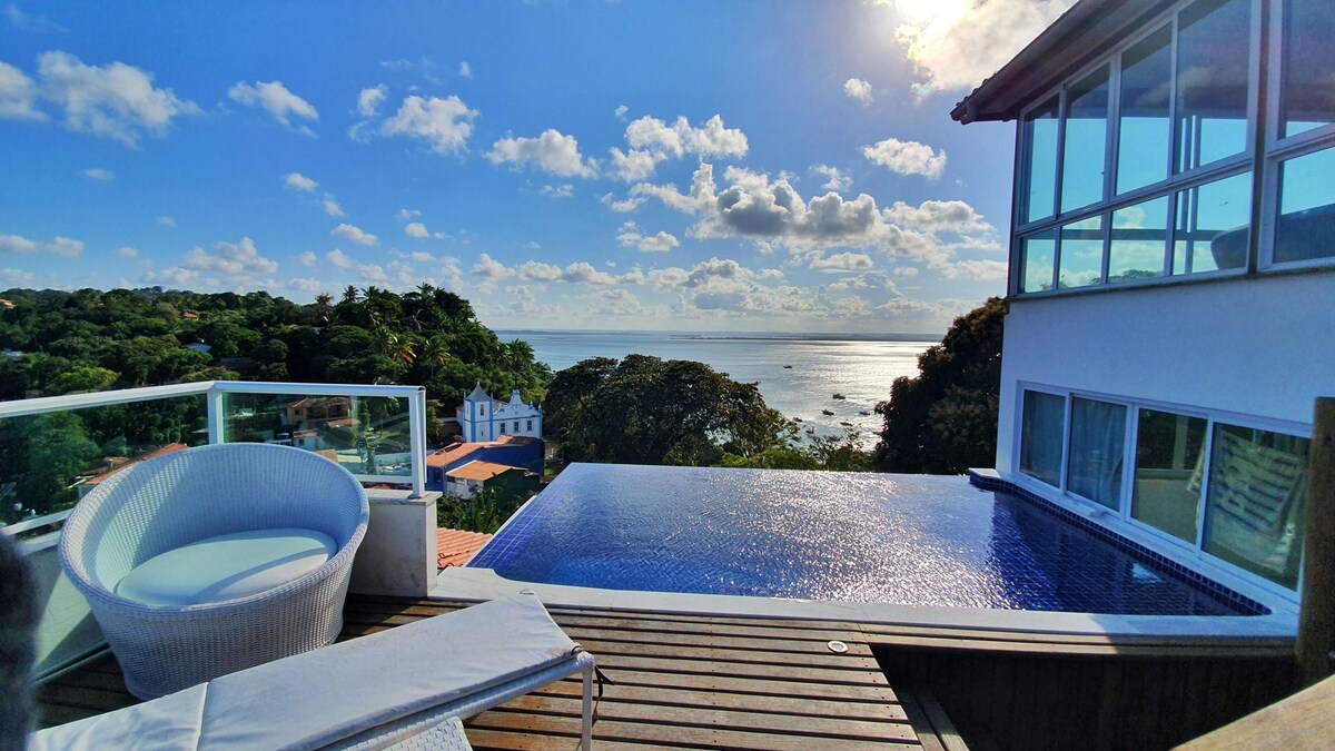 No alto do Morro de São Paulo, o Canto das Águas é um refúgio com vista para o mar e o pôr do sol de tirar o fôlego. Da praça central até aqui é uma caminhada de 15–20 min (1km), com algumas ladeiras e degraus. A recompensa é toda beleza natural exclusiva e privacidade. Ideal para casais, amigos ou viajantes solo que querem acordar com o azul do oceano. Estamos a 80m acima do nível do mar, com acesso do condomínio às trilhas para as praias Porto de Cima, Ponta da Pedra, Praia da Argila e Gamboa.