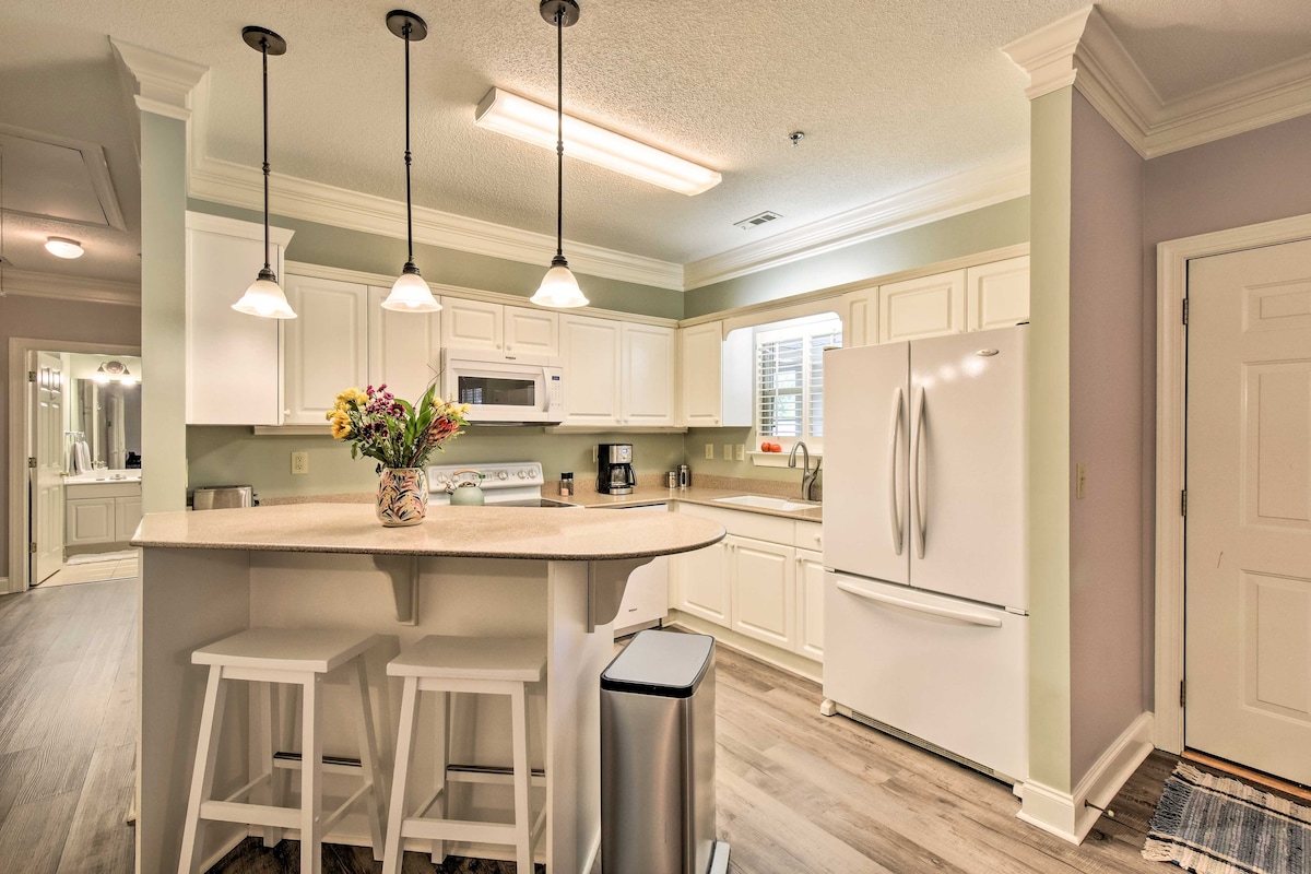 4br/2ba condo. Open concept kitchen and living room with 2br/ba on either end of the living room area. Fully equipped kitchen with dishwasher. Complimentary starter set of paper products( paper towels, toilet paper, trash bags) Plush pillowtop queen mattresses. Closet space and small dresser Roku streaming TVs Bathrooms equipped with double sink vanities and all the essentials. ****Free WiFi. ****Washer and Dryer included ****Condo on the 3rd floor(top level), accessed via stairs