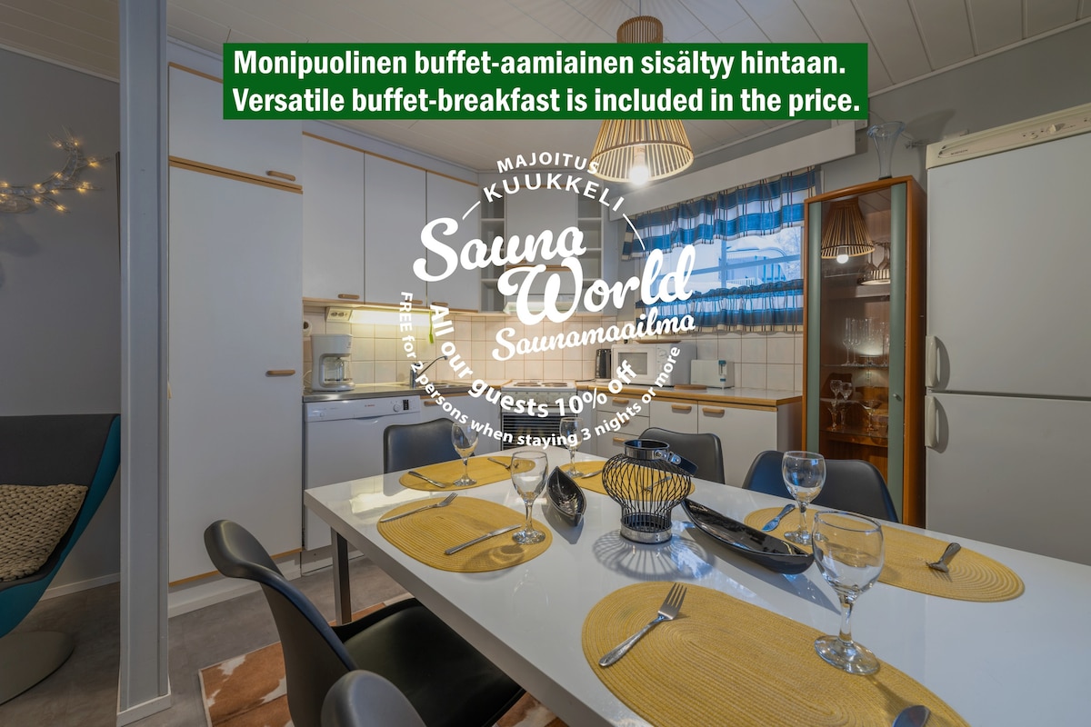 Bine ai venit în cabana noastră confortabilă din bușteni în stil Lappish, perfectă pentru relaxare în familie, cu șemineu și saună. Minunată-te de Luminile Nordului de la fereastra ta. Bucură-te de sporturi de iarnă, cum ar fi săniuș, schi și snowboarding, precum și de activități de vară, cum ar fi pescuitul și drumețiile. De asemenea, oferim safari husky cu reduceri pentru oaspeții noștri. Situat în centrul orașului Saariselkä, aproape de magazine și cafenele. Aeroportul Ivalo se află la 30 km. Parcare gratuită și Wi-Fi.